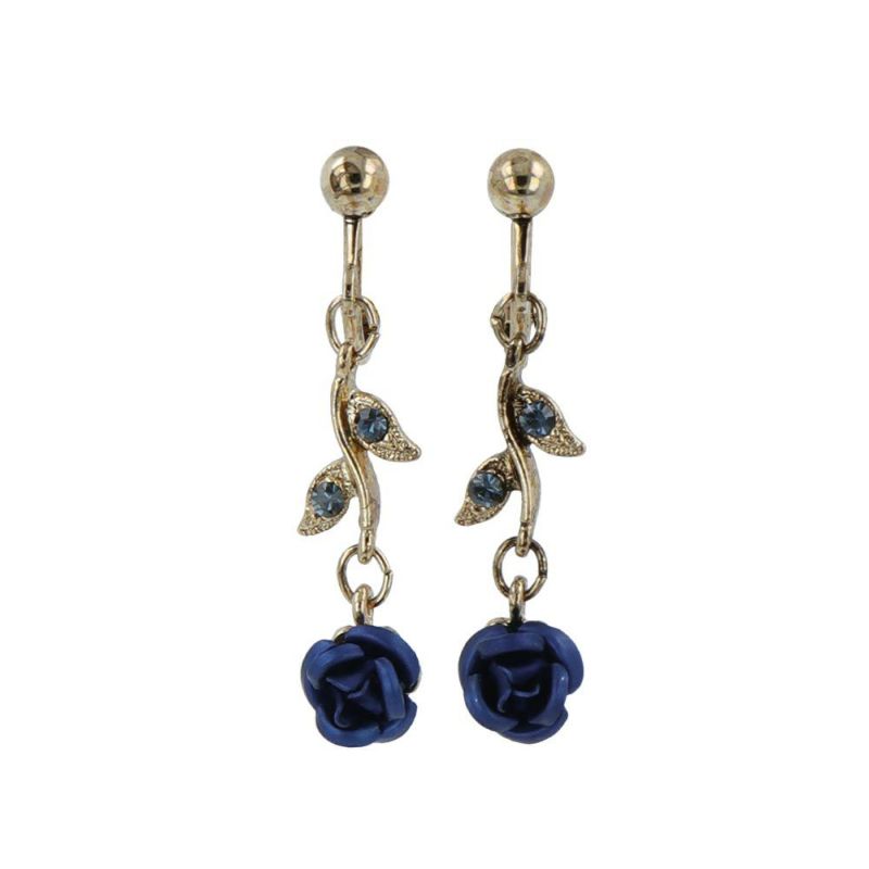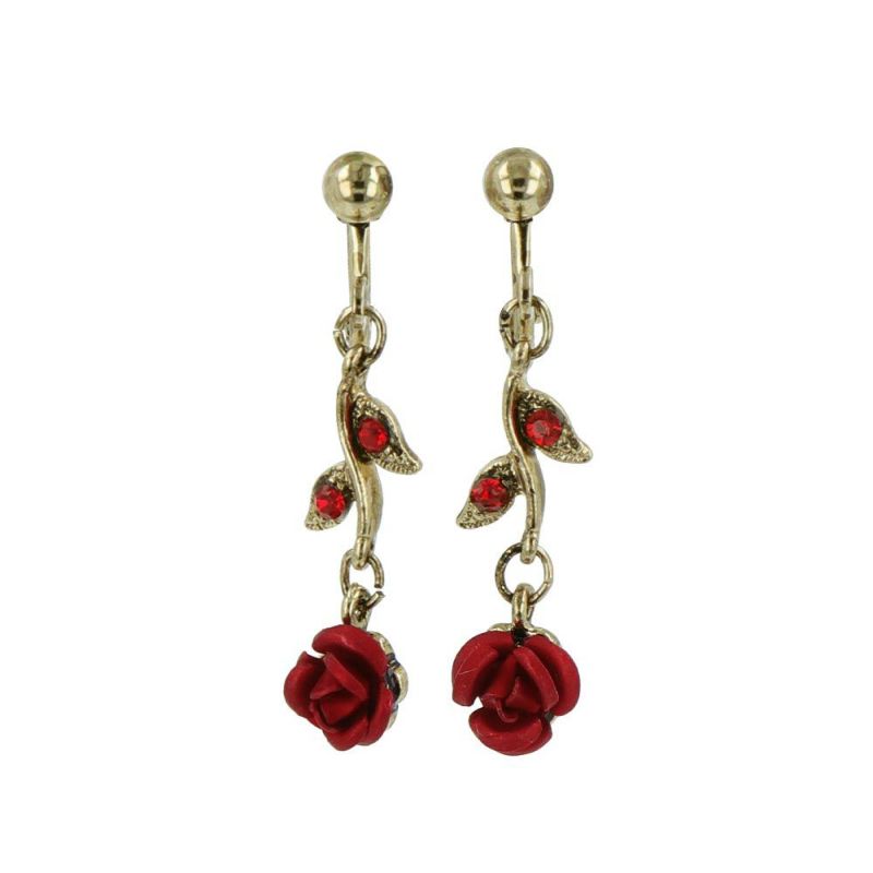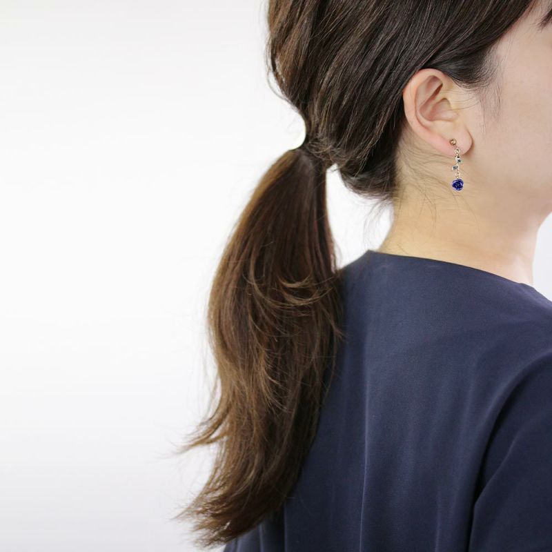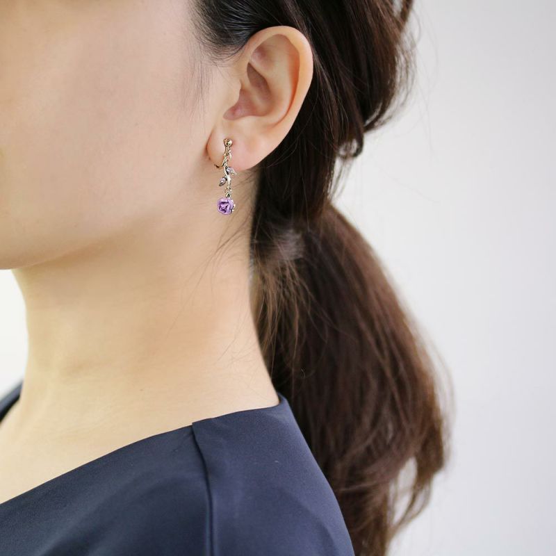 人気のローズモチーフを使ったイヤリング。ダークカラーの薔薇とアンティークゴールドとの組み合わせがエレガントでシックな雰囲気。まるで童話や映画のような物語を感じさせるデザインです。