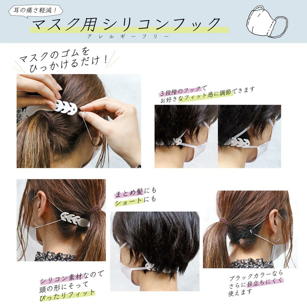 マスク用シリコンフックは、ゴムをひっかけるだけで耳の痛さを軽減してくれる便利なアイテム。アレルギーフリーのシリコン素材で3段階サイズ調整可能、頭のかたちにぴったりフィットします。シンプルな白黒モノトーンカラーの2個セットです。