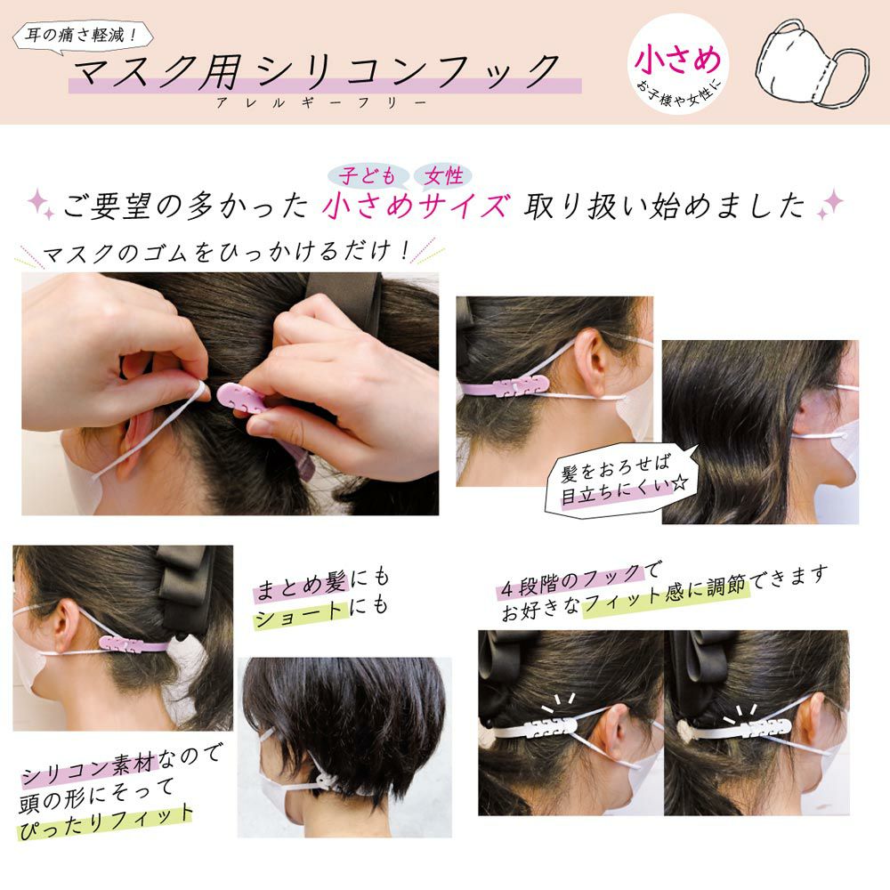 マスク用シリコンフックは、ゴムをひっかけるだけで耳の痛さを軽減してくれる便利なアイテム。アレルギーフリーのシリコン素材で4段階サイズ調整可能、頭のかたちにぴったりフィットします。お子様や女性に丁度良い、小さめサイズとなっています。