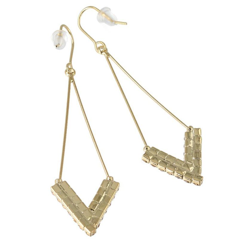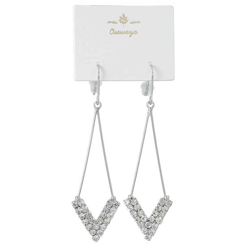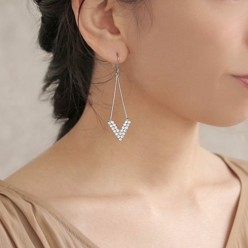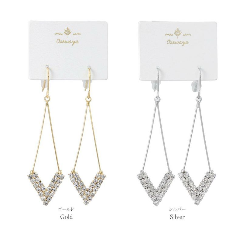 pc0050インパクトのあるV字ストーンがキラキラと輝くロンバス型の下がりフックピアス。光沢のあるメタリックカラーでゴージャスな印象をプラス。存在感のある大きめシルエットで顔周りを華やかに彩ってくれます。パーティーシーンやシンプルなコーディネートのアクセントとしてもおすすめのアイテムです。