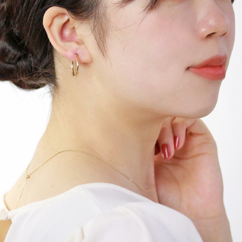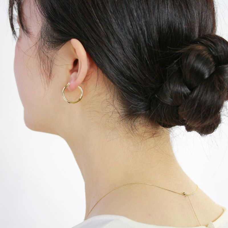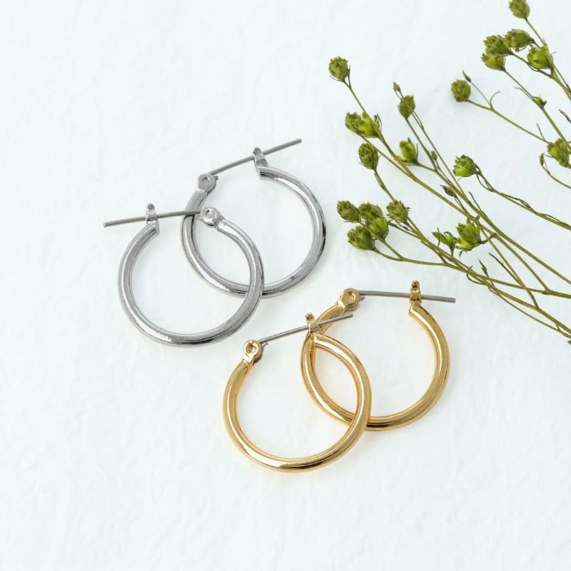 どんなスタイリングにも似合うシンプルなメタルのフープピアス。正面から見ると少しぽってりとした丸みのあるシルエットとなっています。ユニセックスに使えるのでプレゼントにもおすすめです。