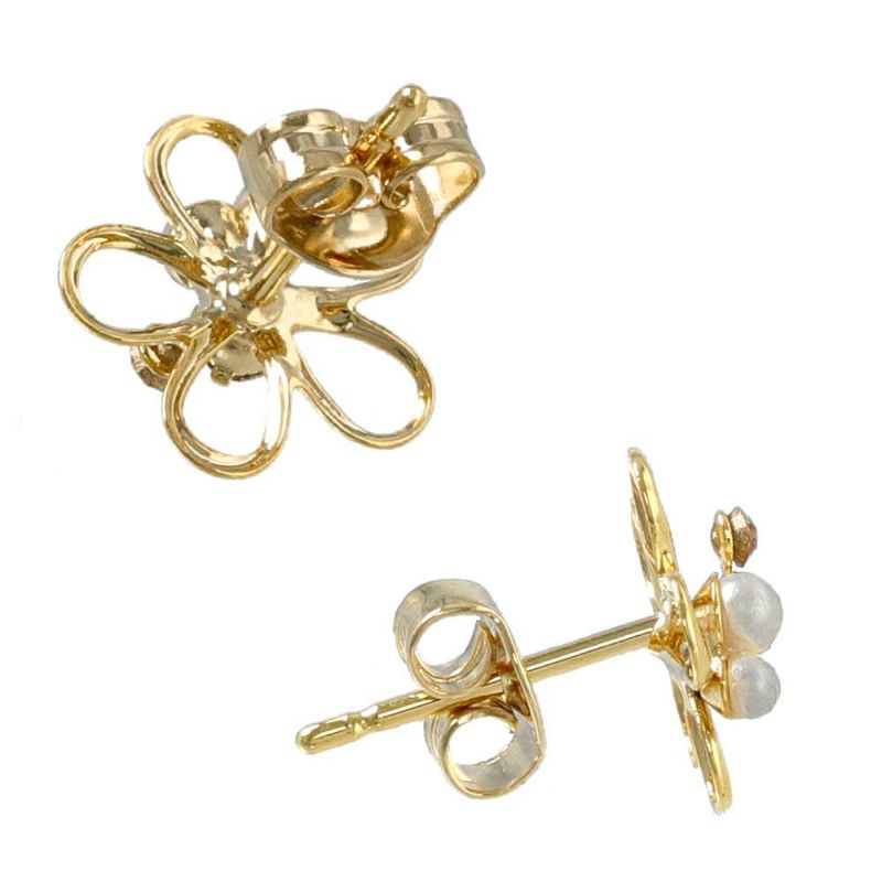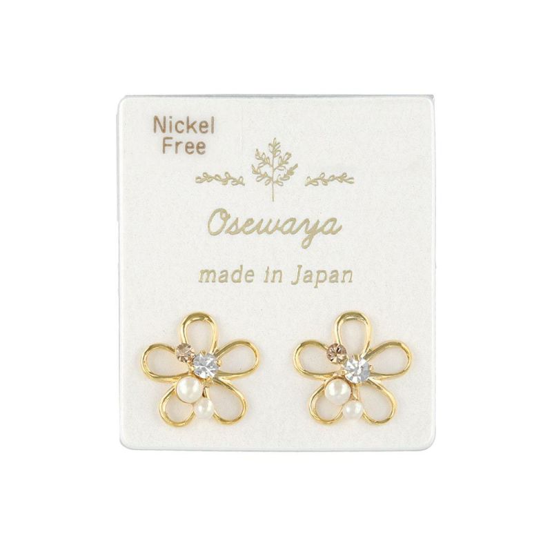 pp0214パールとストーンをあしらったメタルのちいさなお花のピアス。ミニサイズで甘さひかえめ、いつだって使えるお花モチーフ。耳元にそっと控えめな華やかさを添えてくれるアイテムです。
