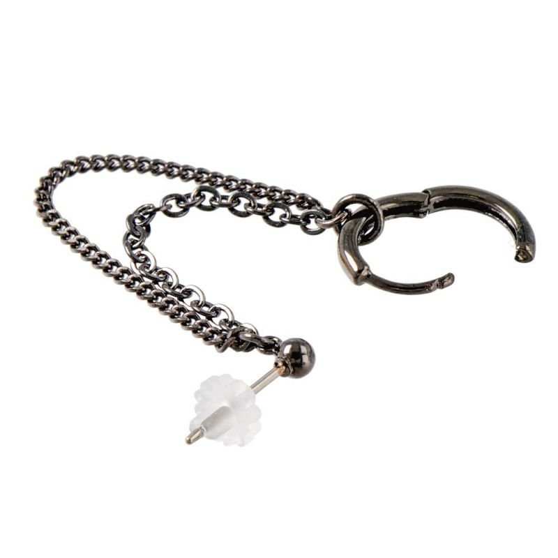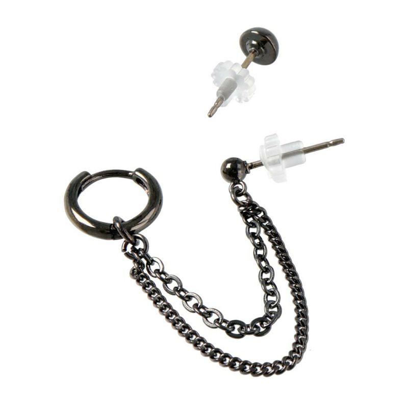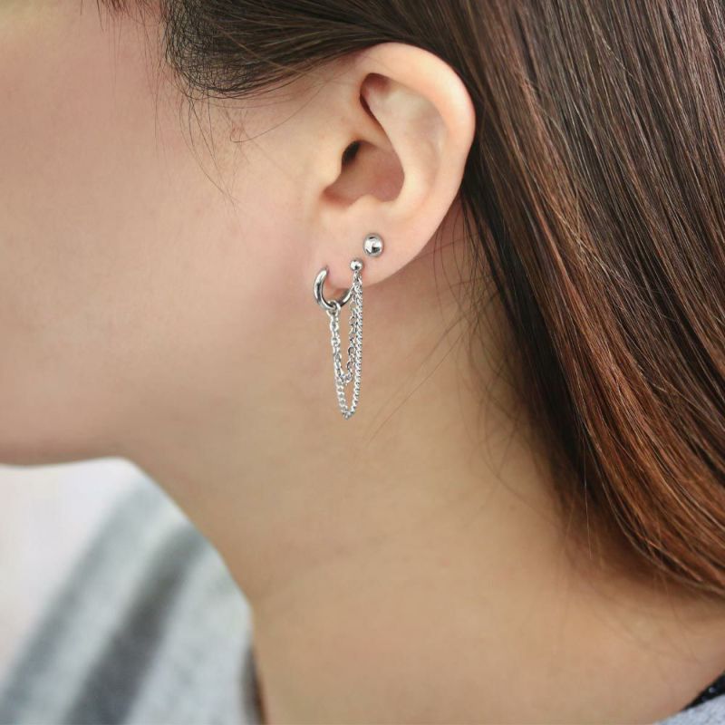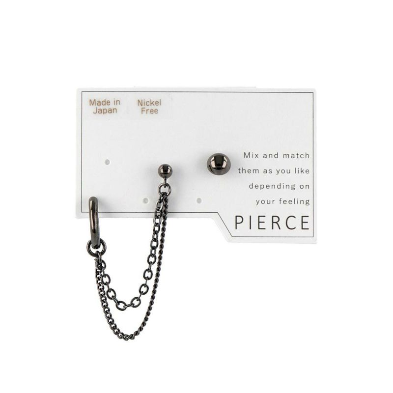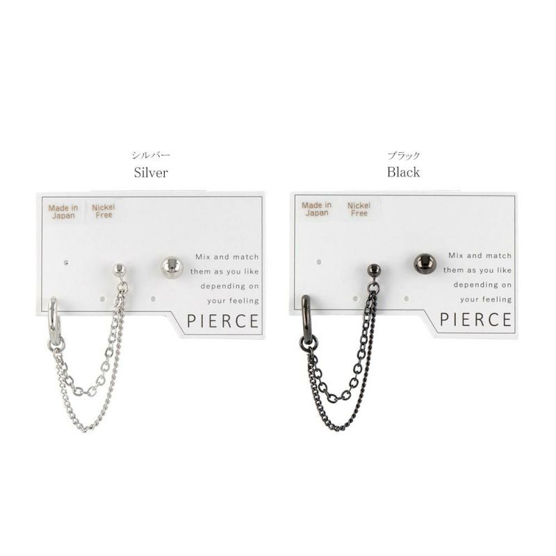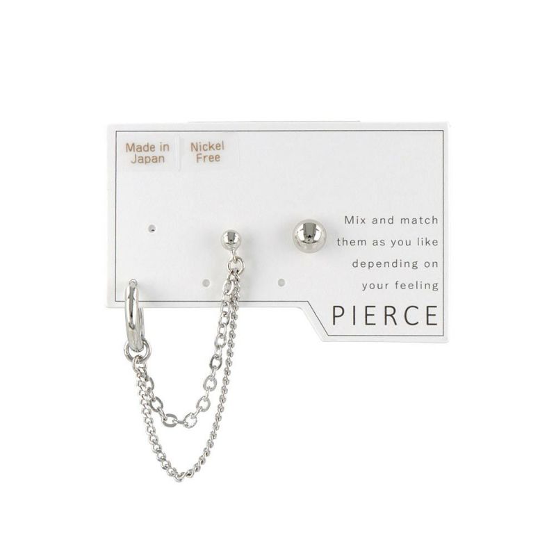 目を引く個性的なデザインのセットピアスは、コーデの良いアクセントに。2つのピアスがチェーンで繋がったデザインなのでピアスホールが片方に複数開いている方にオススメです。