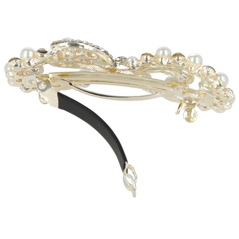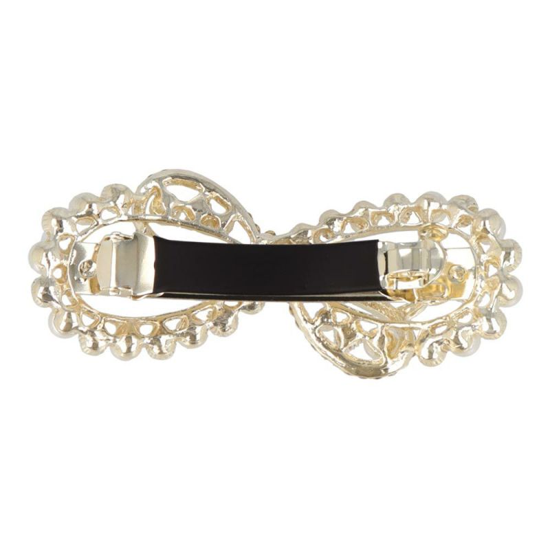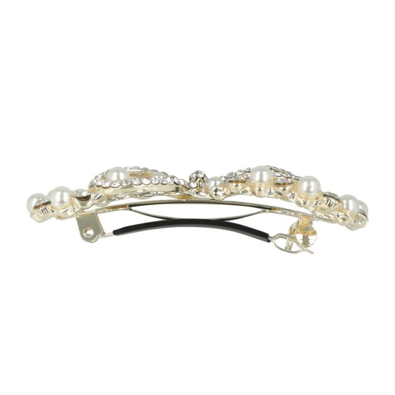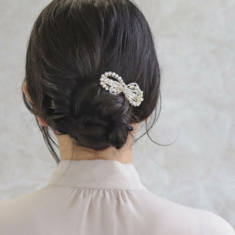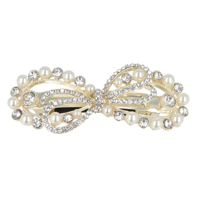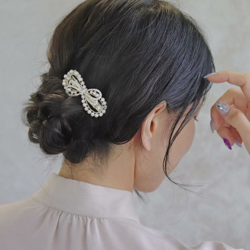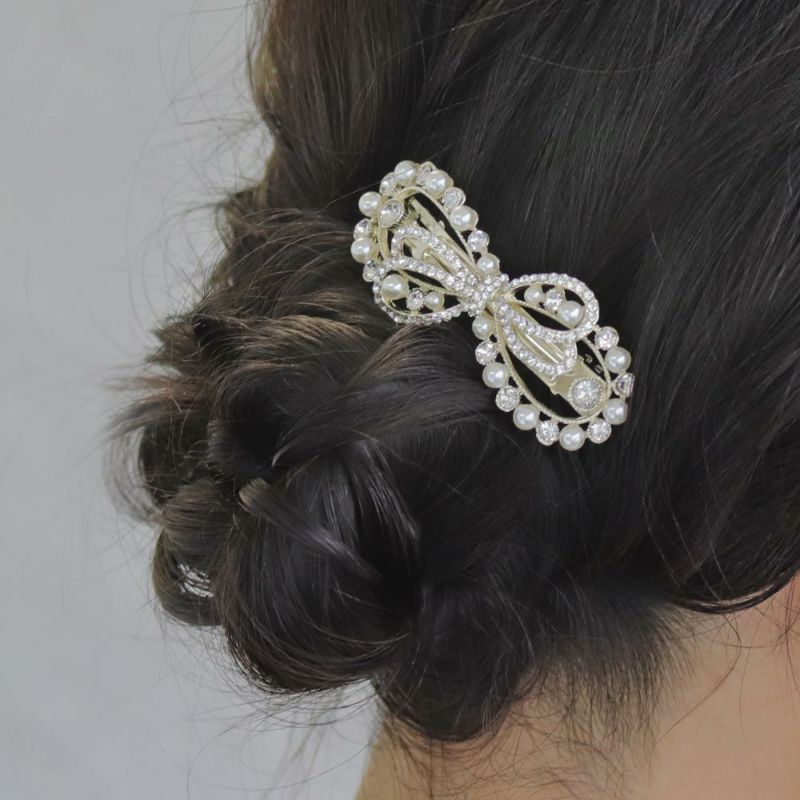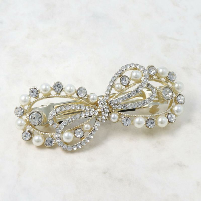 vt0127パールとストーンが上品にきらきらと輝く、華やかなバレッタ。リボンモチーフで可愛さたっぷりの乙女心くすぐるデザイン。普段使いはもちろんイベント等にも◎
