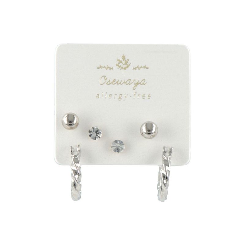 ひねりフープ、メタルボール、ストーンがセットになった樹脂ピアス。その日の気分でお好きな組み合わせが楽しめます。年齢や性別を問わないシンプルなデザインで、プレセントにもお勧めです。