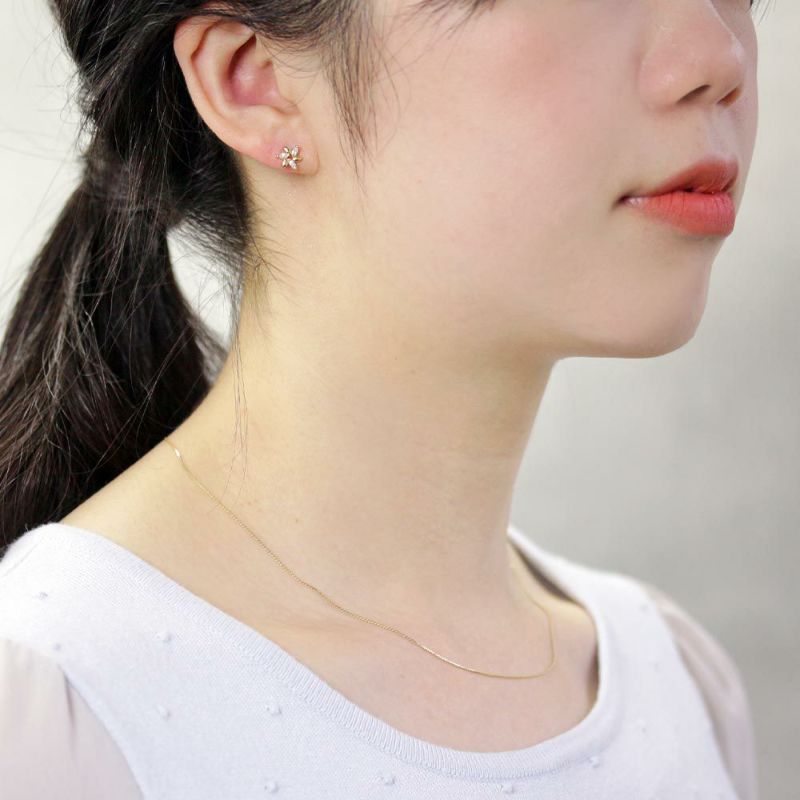 金属アレルギーが出にくい18金ポストで、お肌に優しい作りになっています。※すべての方に金属アレルギー反応が出ないこと(アレルギーフリー)を保証するものではございません。 皮膚に異常を感じた場合は直ちにご使用を中止し、専門医にご相談ください。