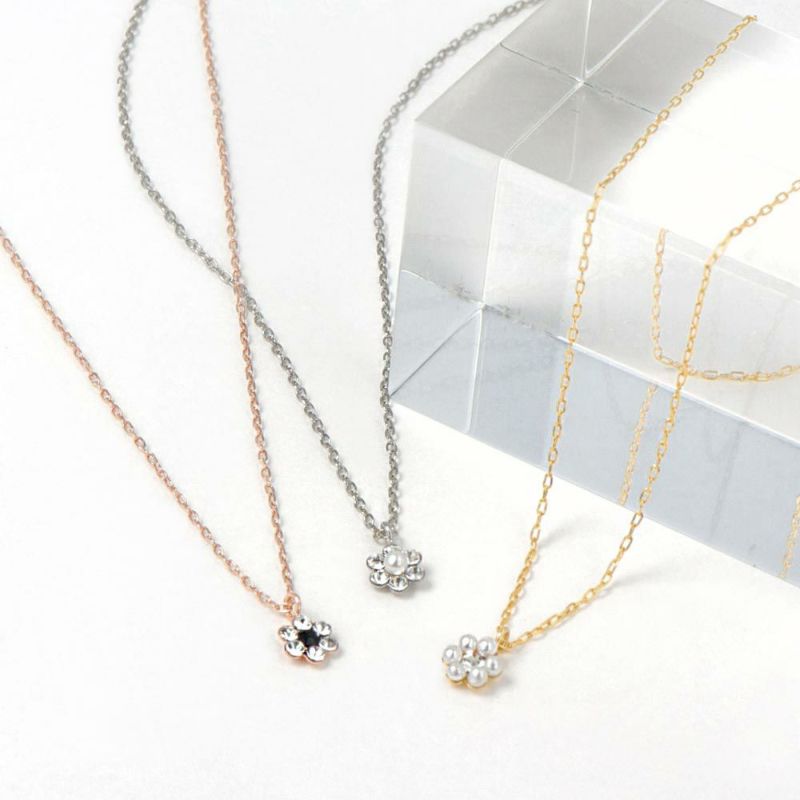 ストーンとパールが輝くフラワーモチーフが上品なデザインのプチネックレス。デイリー使いにちょうど良い華奢なチェーンで女性らしい繊細な首元を演出できます。