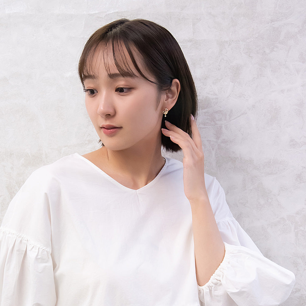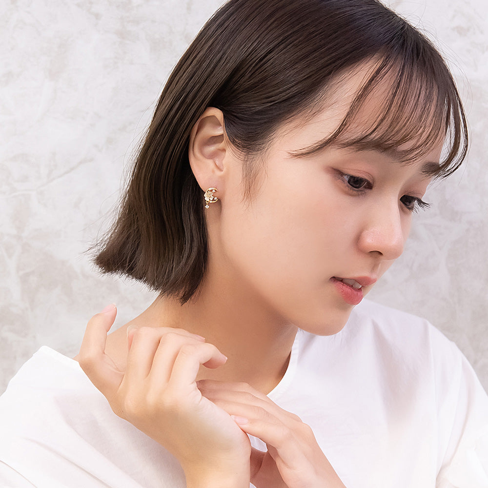 お花と三日月のモチーフがロマンチックなピアスは、ミニサイズで甘さひかえめ。