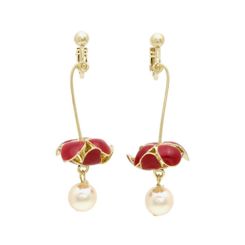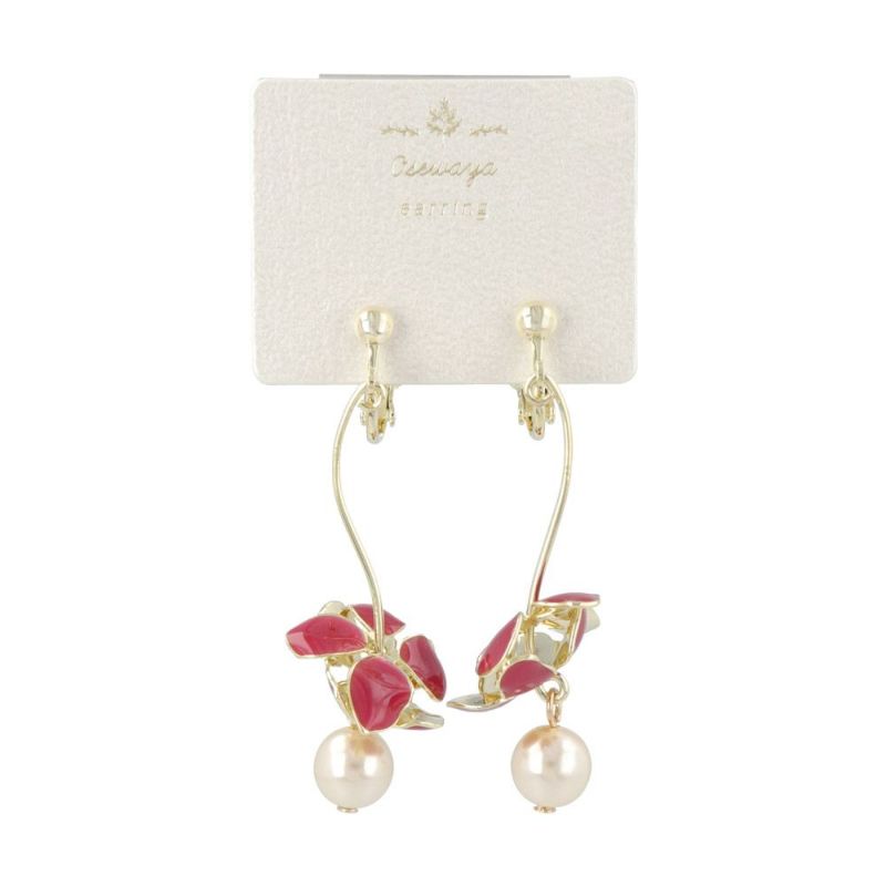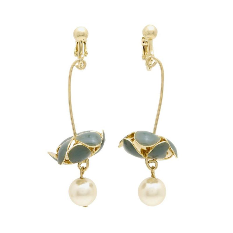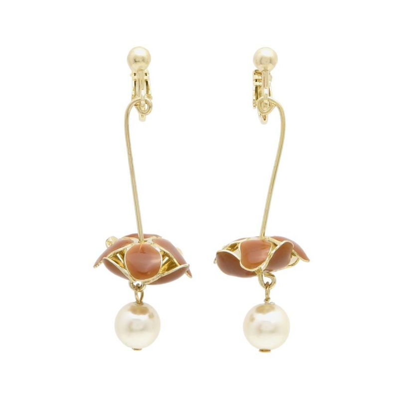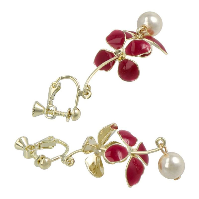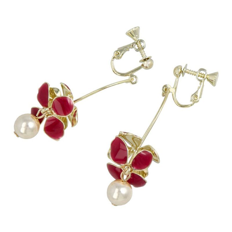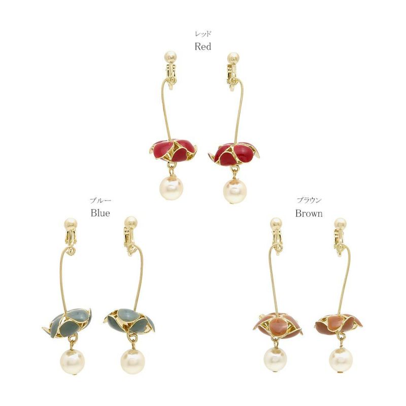 イヤリング メタル カラー フラワー パール 下がり ネジバネ式イヤリング