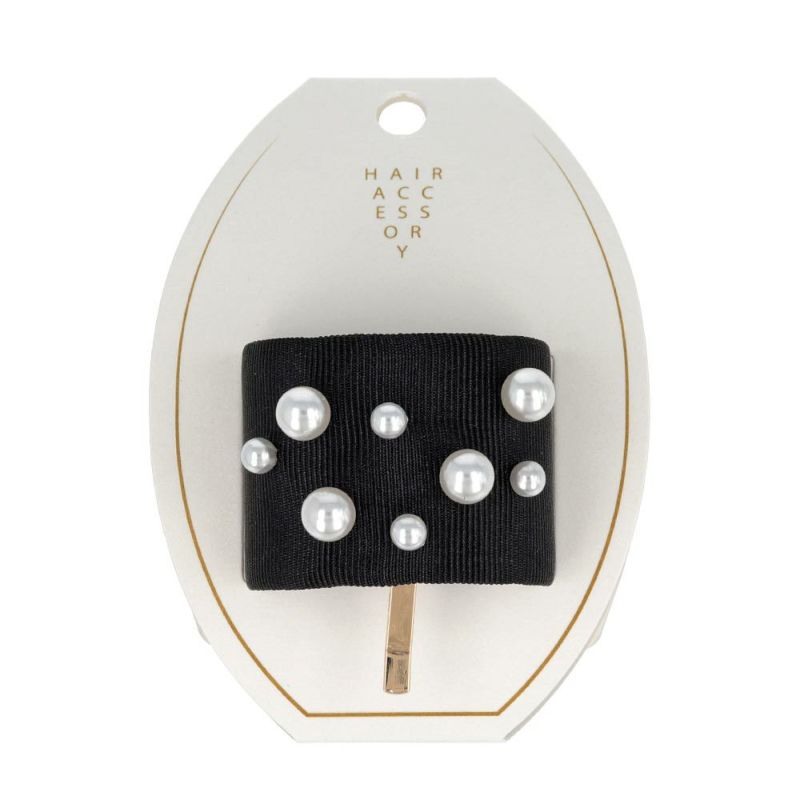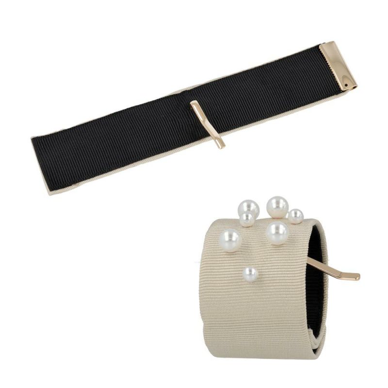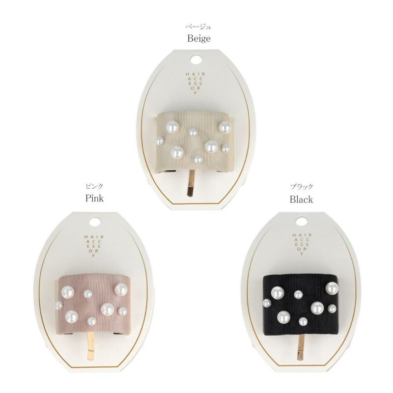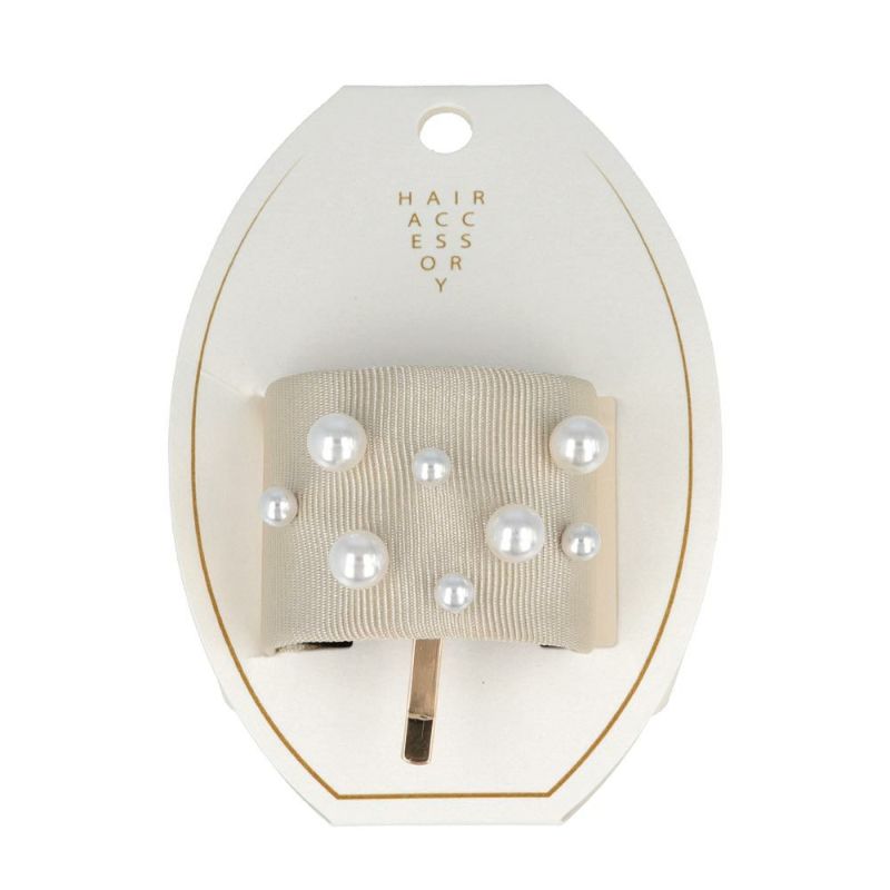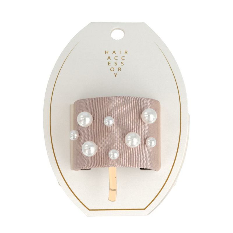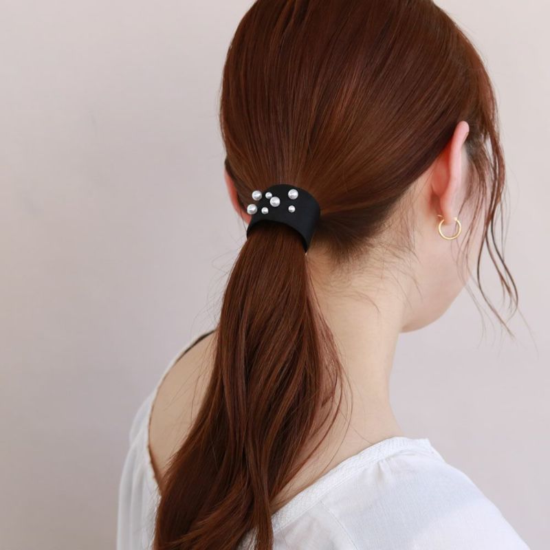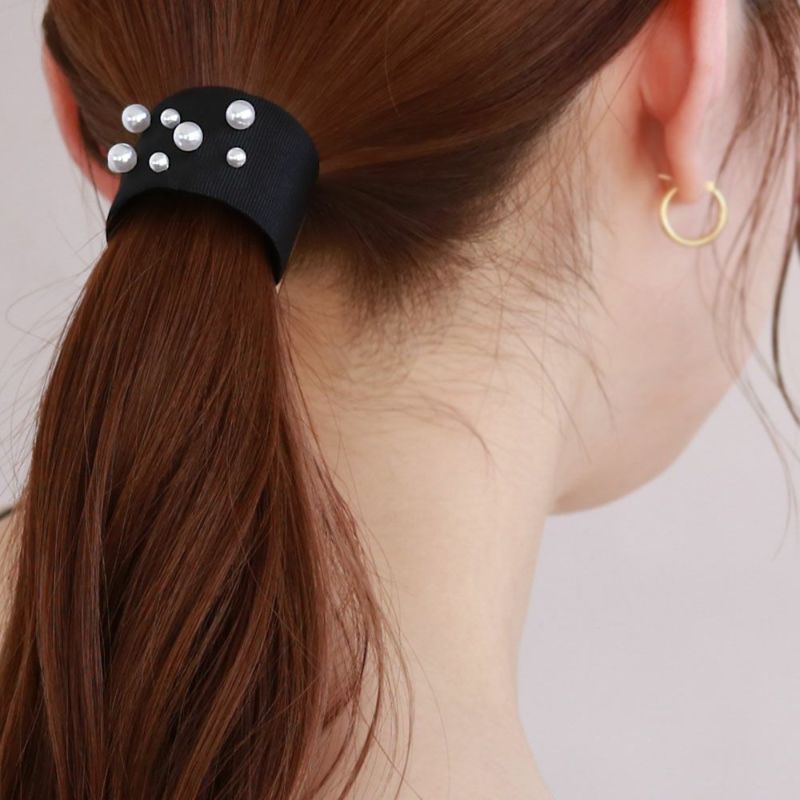 hc0327ランダムについたパールがアクセントになったクラップカフ。ロールリボンを広げて、ヘアゴムの結び目にメタルピンを挿し、くるんと巻くときれいに留まります。