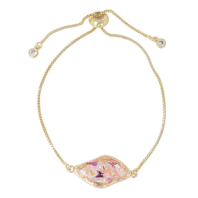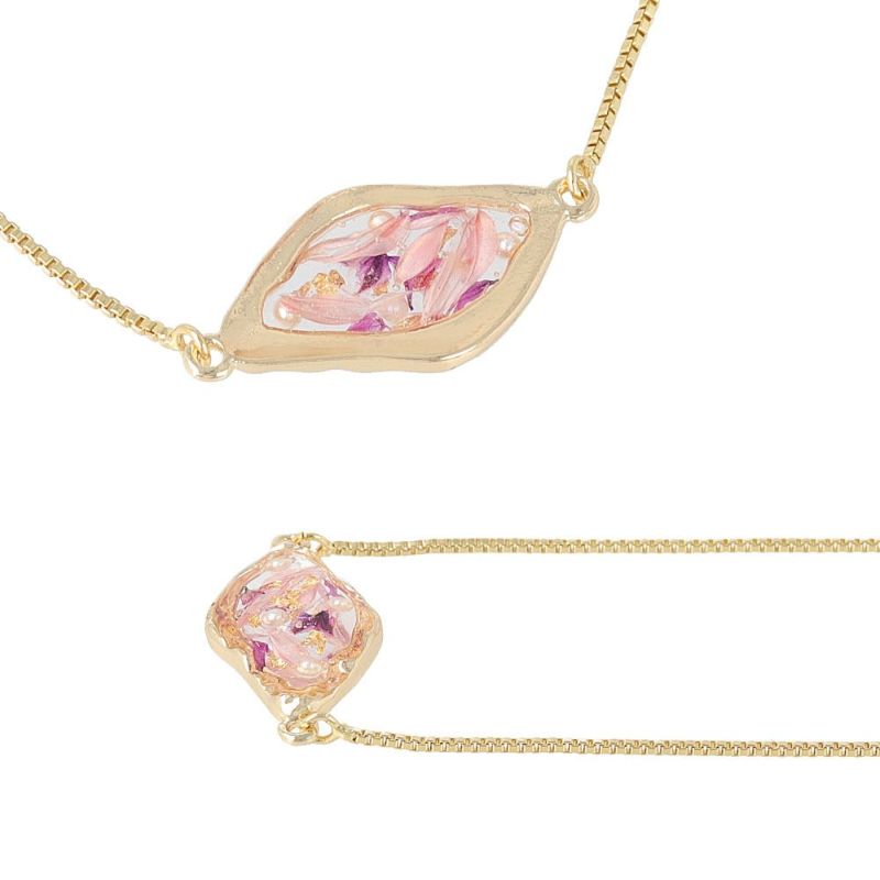 bl0475見た目にも美しいハーバリウムみたいなアクセサリーは、ドライフラワーやパールなどのパーツを封入したゆるシルエット。ちいさなモチーフにかわいいをつめこんだ、品のあるレディーなアイテム。サイズ調節が簡単にできる便利なスライド式のブレスレット。