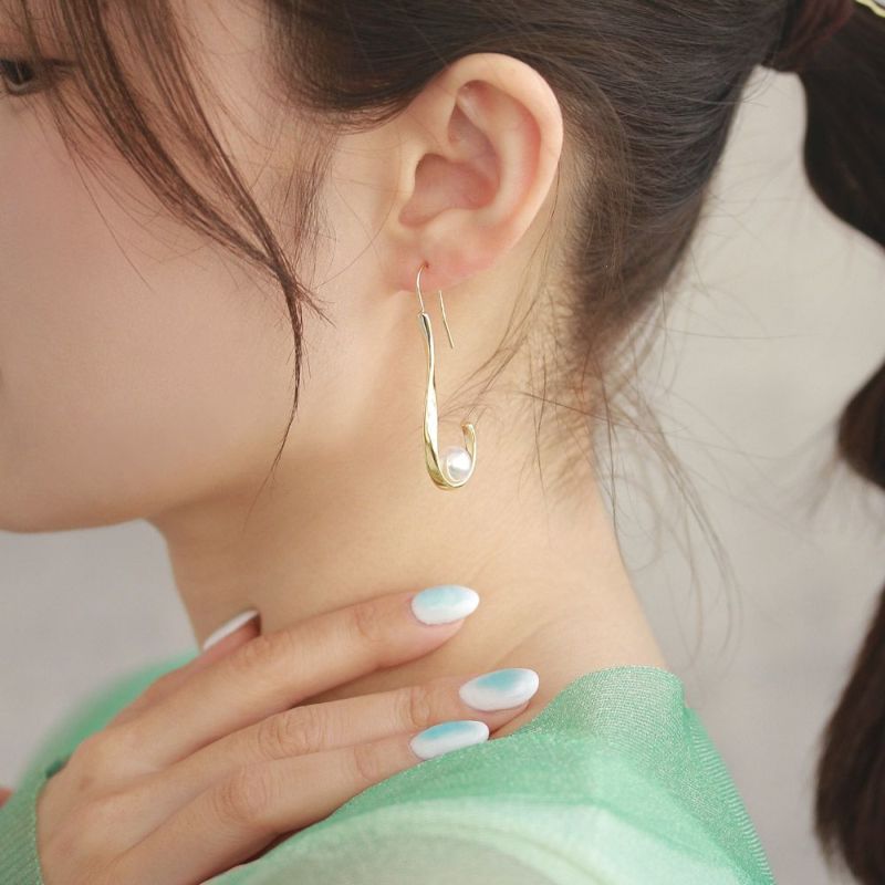 やわらかな曲線、Round(円形)を意味するデザイン。ポイントにあしらったパールが品良く、オンオフ問わず毎日でも使えるピアス。