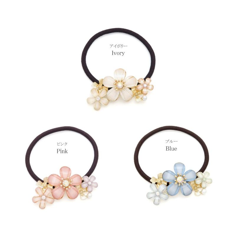 pn0546カットアクリルの艶がきれいな花モチーフのヘアゴムは、オンオフともに合わせやすい上品なデザイン。