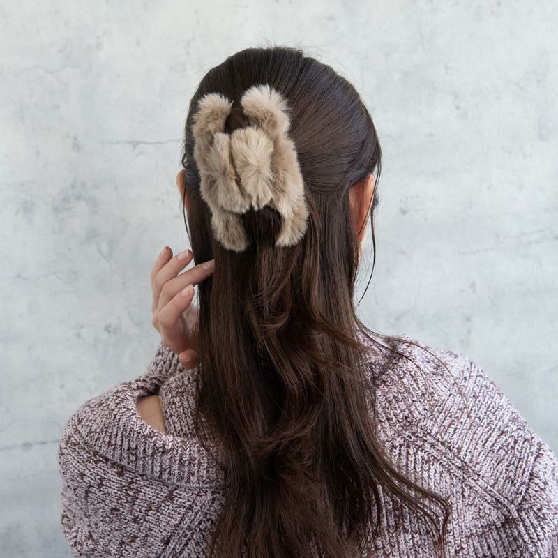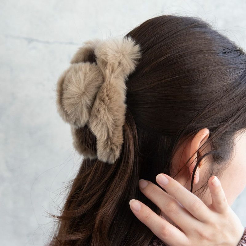 bs0639レディ度高めファー素材のバンスクリップ。いつものコーディネートが簡単に秋冬使用に。ヘアアレンジに添えるだけで一気にこなれた印象に。カジュアルからキレイめまで幅広いコーデと好相性。万能カラーで使い勝手◎