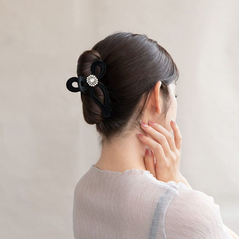 ヘアクリップ フロッキー パール ビジュー アンティークライク リボン バンスクリップ