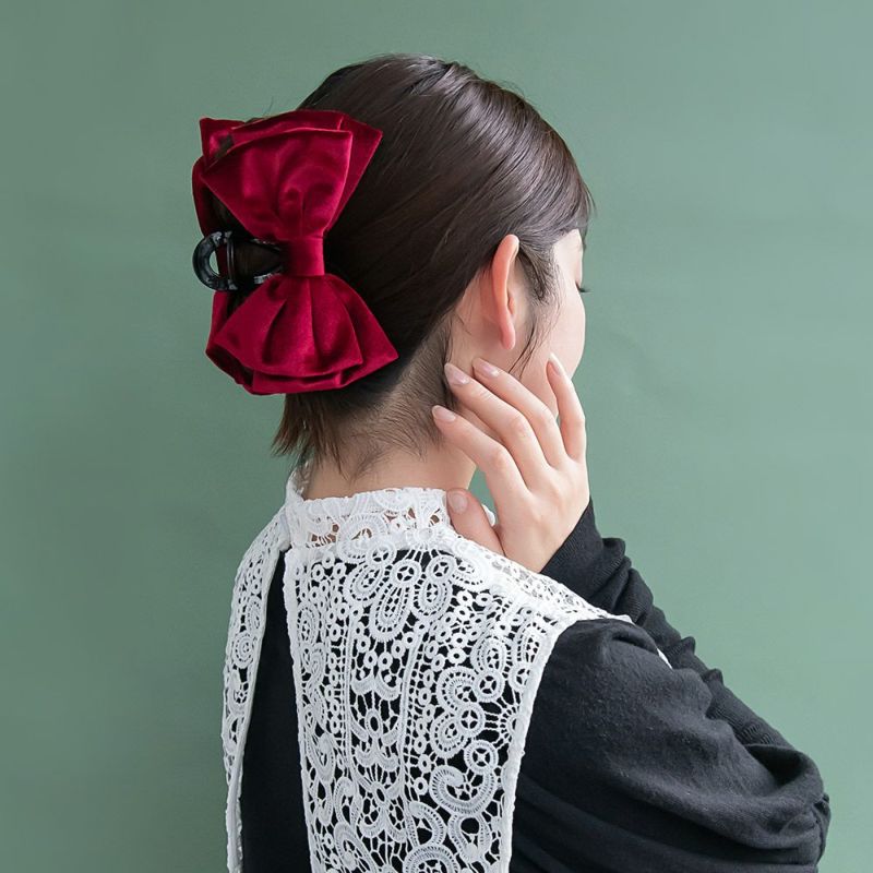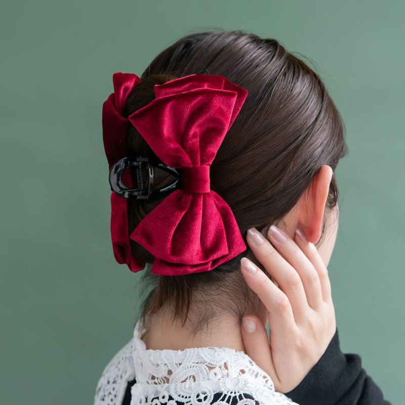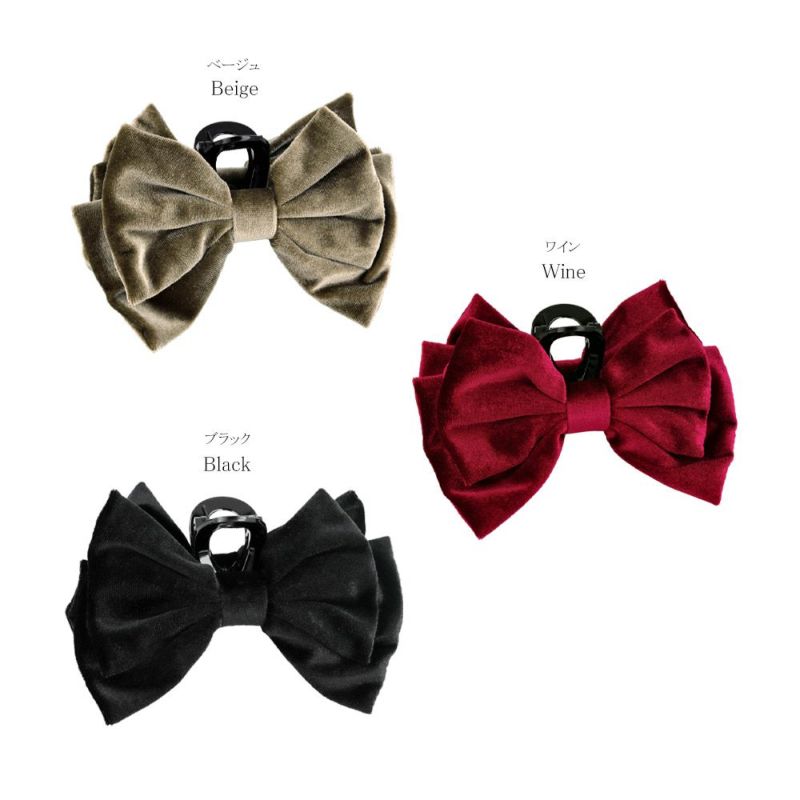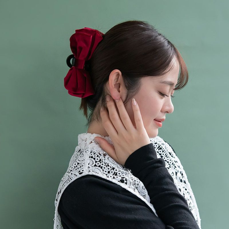 bs0649大きめのボリューム感あるリボンがかわいい、バンスクリップ。キレイな光沢感が美しい、ベロア調の素材。秋冬コーデに映える華やかさ。甘さをひとさじくわえるのにちょうどいい、品よく落ち着きある色味。差し色使いに◎ちょっとしたおめかしスタイルにも◎