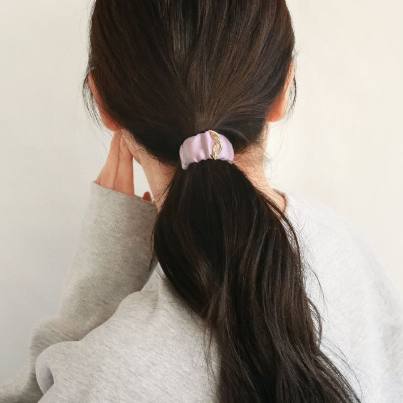 ロール部分をカチッと鳴るまで広げ、ヘアゴムの結び目にピンを挿します。そのまま髪をつつむように”くるん”と巻けば完成です。ゴムの結び目が見えないのでキレイな仕上がりに。