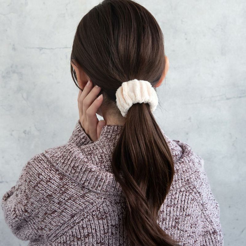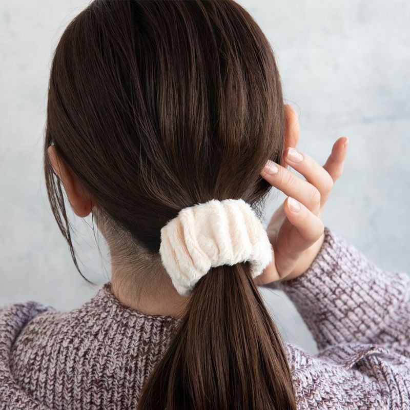 ロール部分をカチッと鳴るまで広げ、ヘアゴムの結び目にピンを挿します。そのまま髪をつつむように”くるん”と巻けば完成です。ゴムの結び目が見えないのでキレイな仕上がりに。