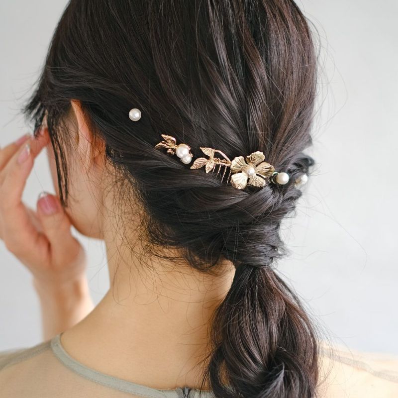 Classy コーム ニッケルフリー フラワー メタル パール ストーン ヘアチャーム 5個セット ヘアコーム ワイヤーコーム