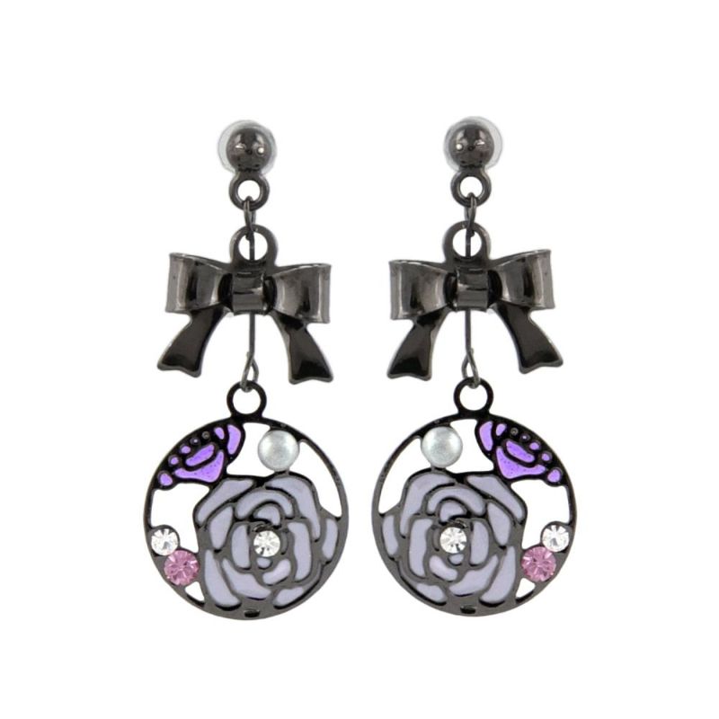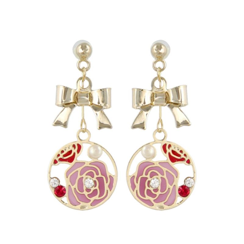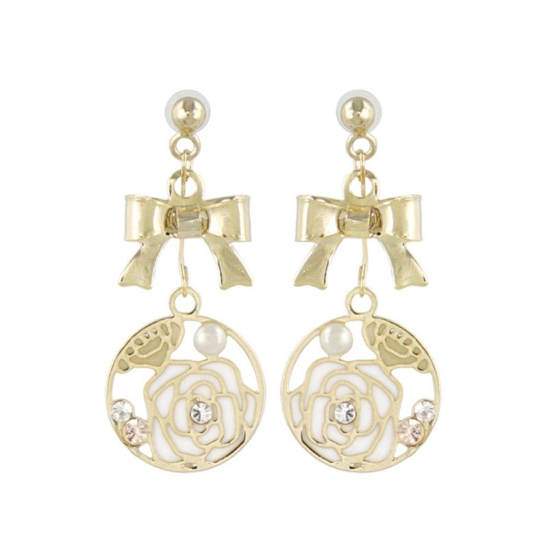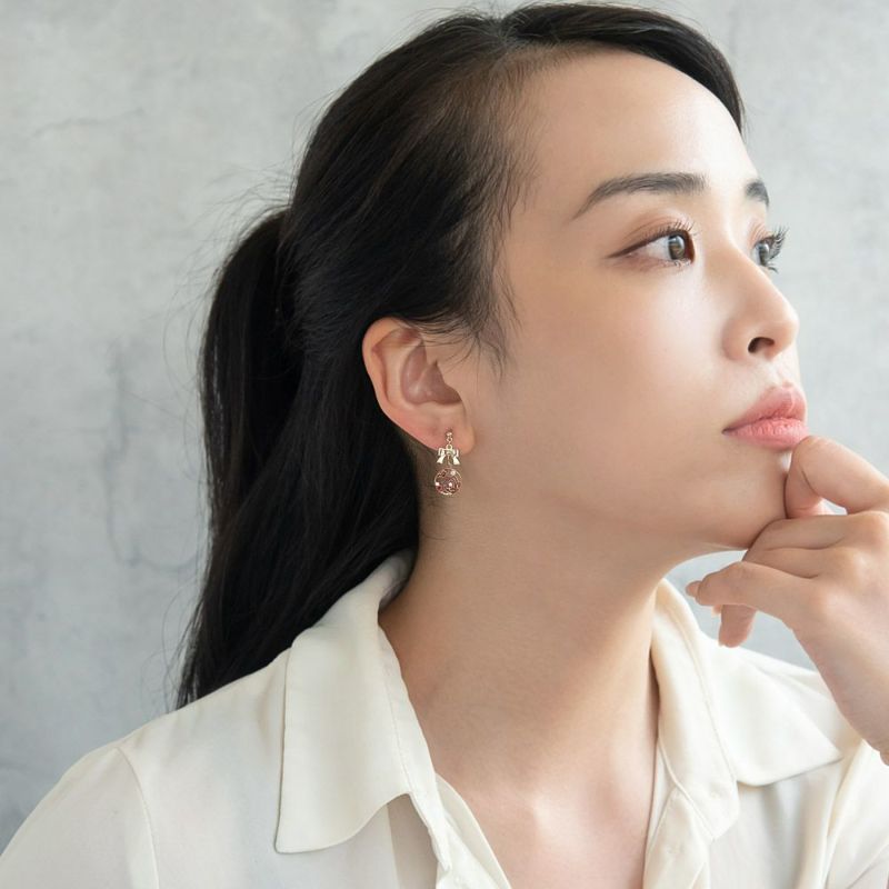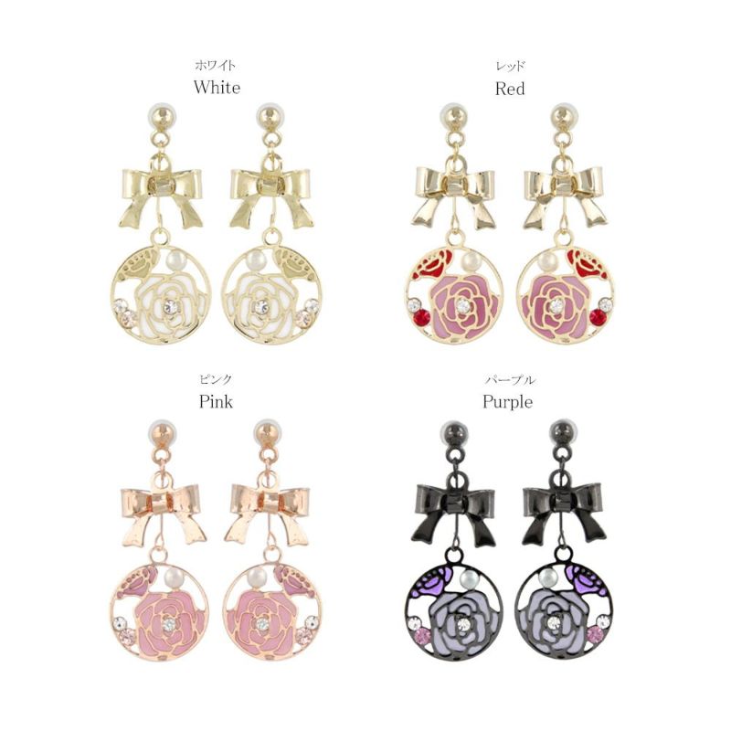 jp0687甘く香る薔薇の品良く美しいディティールをそのままに。心ときめく、リボンとロマンティック気分高まるローズモチーフでコーデに華やかさをプラス。さりげない揺れ感がかわいい、お花のピアスが耳元に彩りを添えてくれます。
