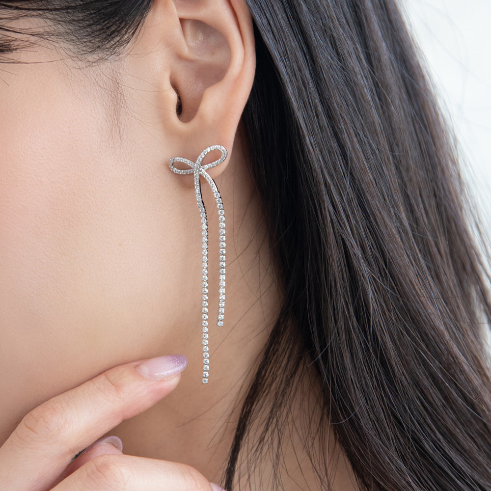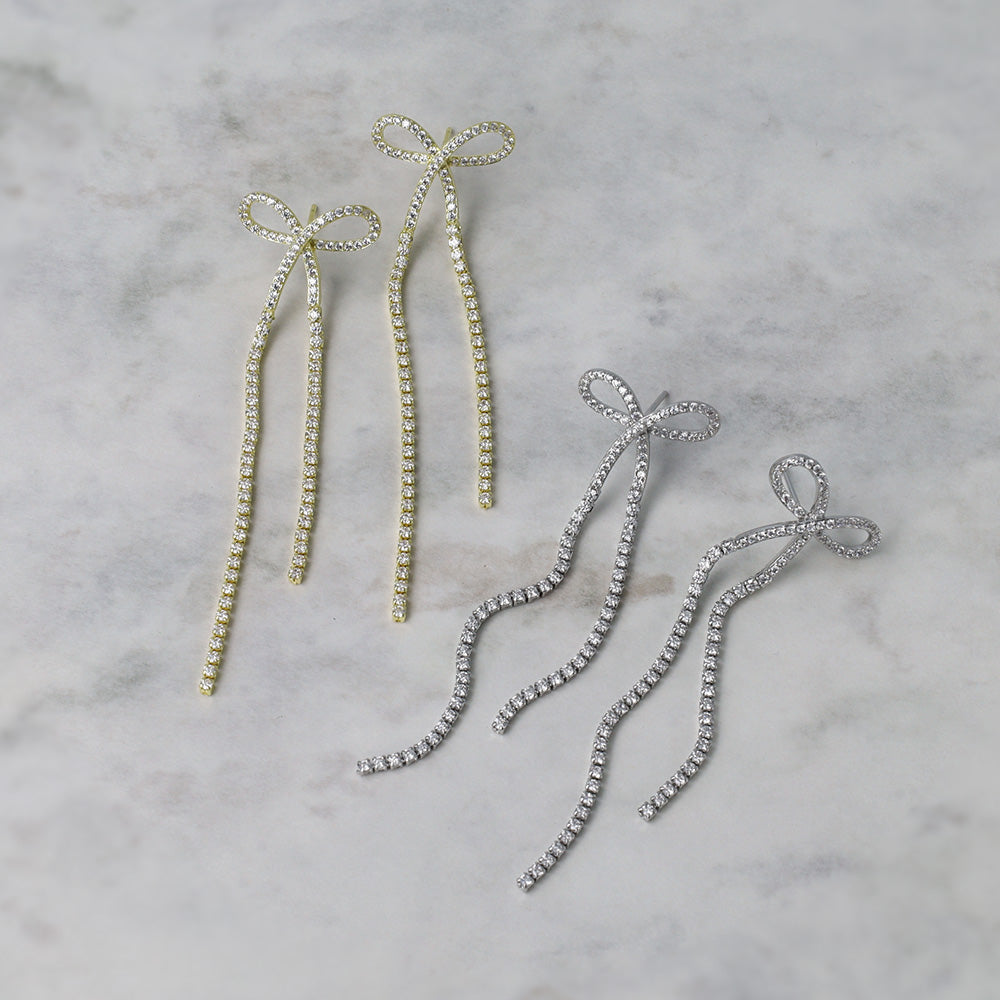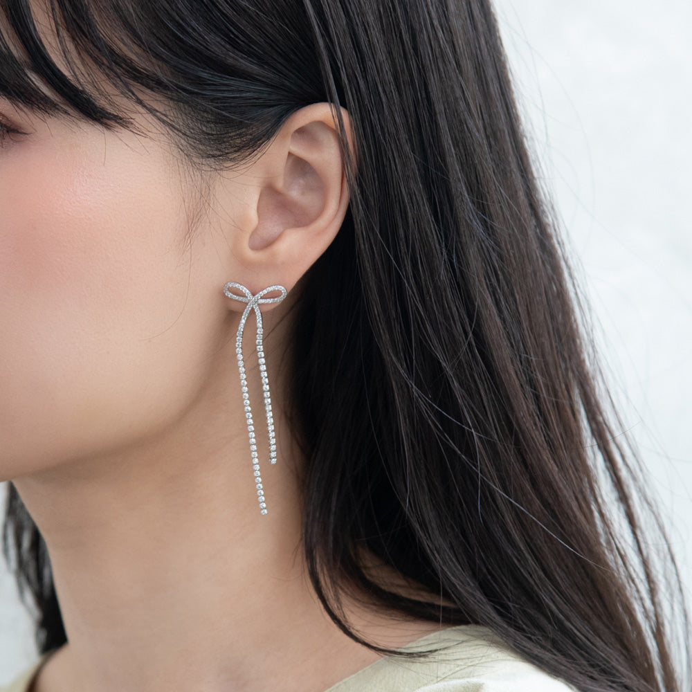 いまこそ取り入れドキ!オトナもつけたくなるトレンドのリボンアイテム。ゆらーんとしたシルエットがかわいい。メタル素材で甘くなりすぎず上品に仕上がるリボンがゆれるピアス。贅沢にあしらわれたキュービックジルコニアが輝く、華やかなデザイン。