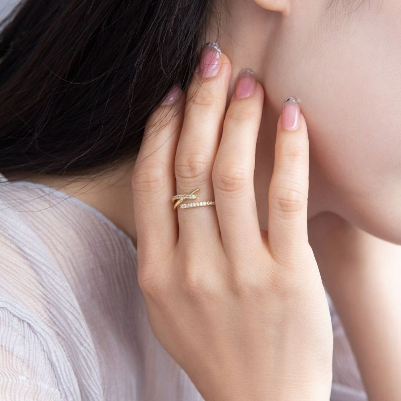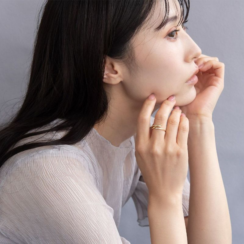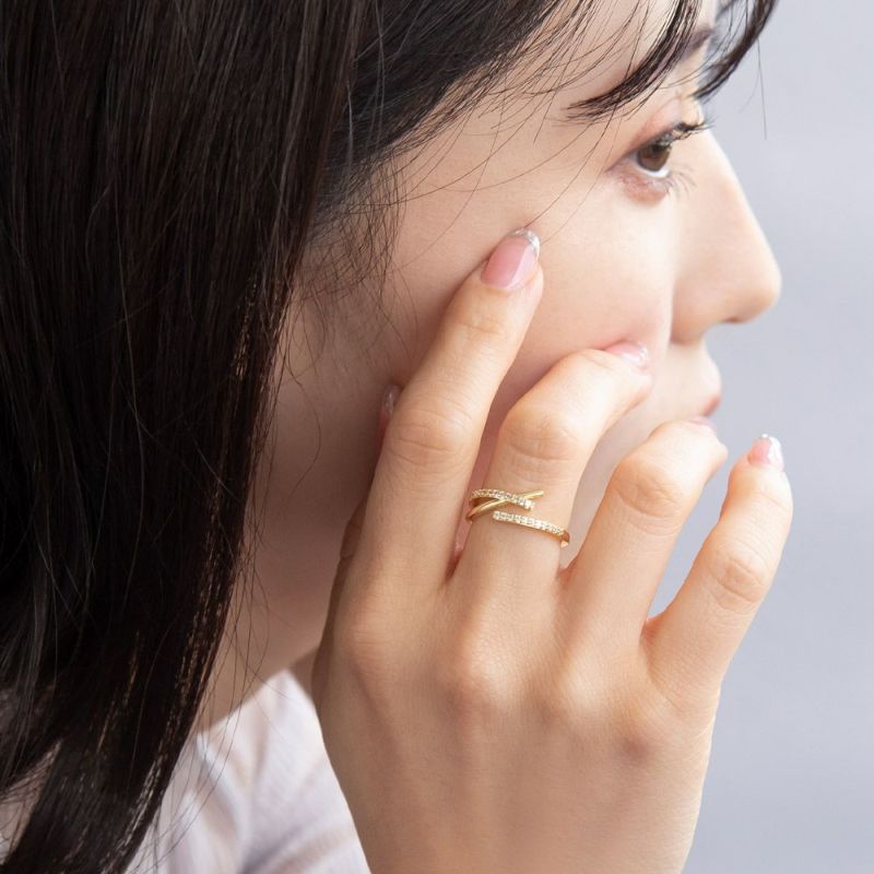 rb0698さらっと身に着けてなじむ、1つでレイヤード感が楽しめるスタックリングのようにも見えるおしゃれデザインリング。きらりと美しく輝く、キュービックジルコニアの輝きで華奢だけれど存在感もあってコーデ映え。好印象のキレイめリングをプラスして手元を華やかに。