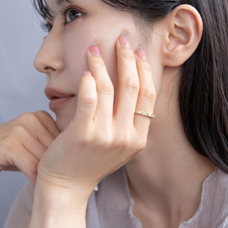 rg0568キュービックジルコニアが輝く、パヴェデザインに3つのハートをあしらったスリムリング。ちいさなハートがかわいい、品のあるレディーなアイテムは、カジュアルコーデとうまくマッチ。ポイントのハートモチーフは、甘すぎないモノトーンカラーで使い勝手◎