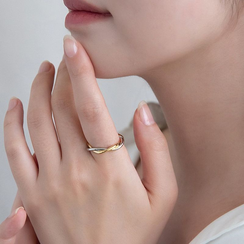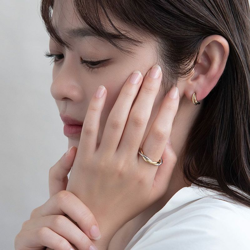 rg0604ひとつでもお洒落みえ、コンビカラーのデザインリング。重なり合う綺麗な曲線で叶うちょっとした抜け感。つや感あるメタルの輝きで存在感もあってコーデ映え。レイヤードもしっくりくるジャストなボリューム感。シーズンレス・ジェンダーレスなデザインで使い勝手抜群◎