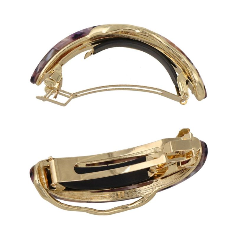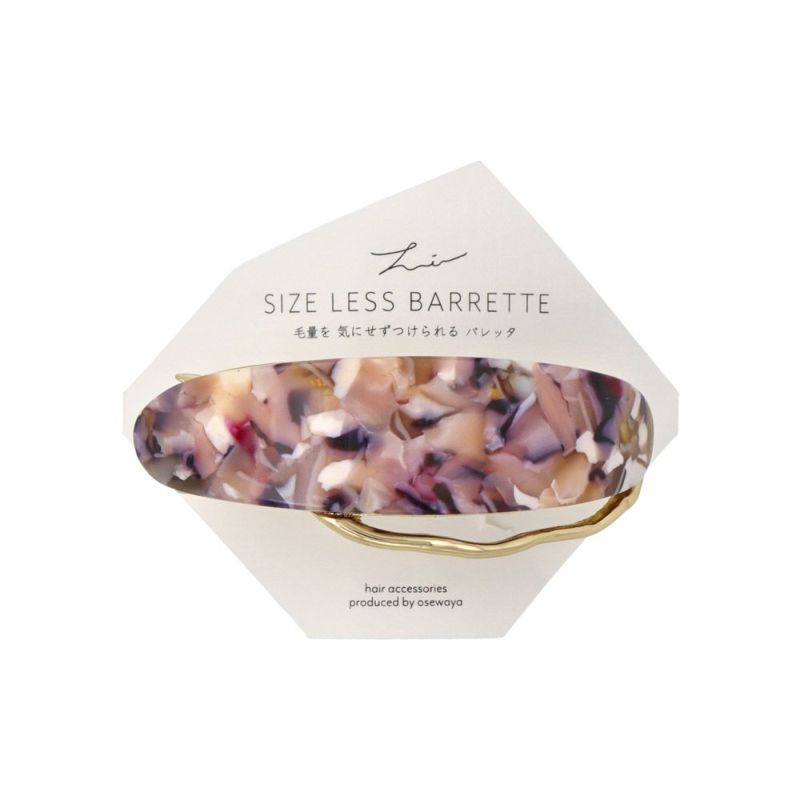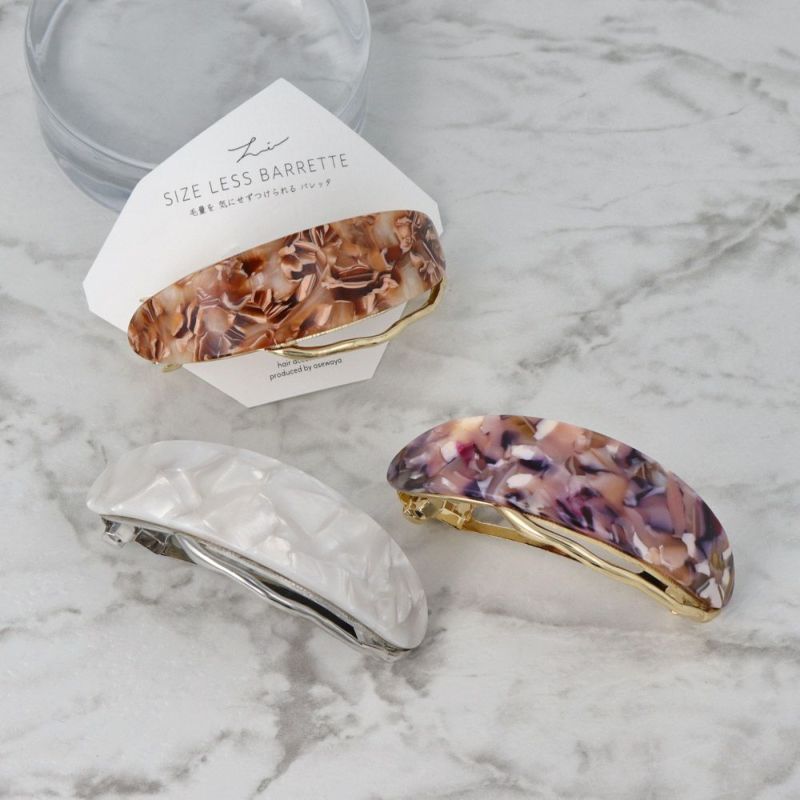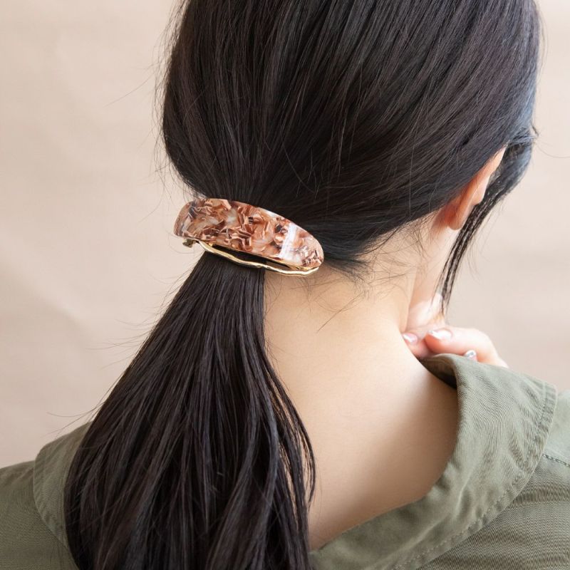 大人コーデに使いやすい、ちょうど良いお洒落さのあるマーブル模様が効いたアートな雰囲気のバレッタ。金具部分は、すべり止め付きでズレにくい仕様になっています。
