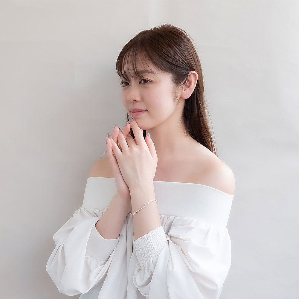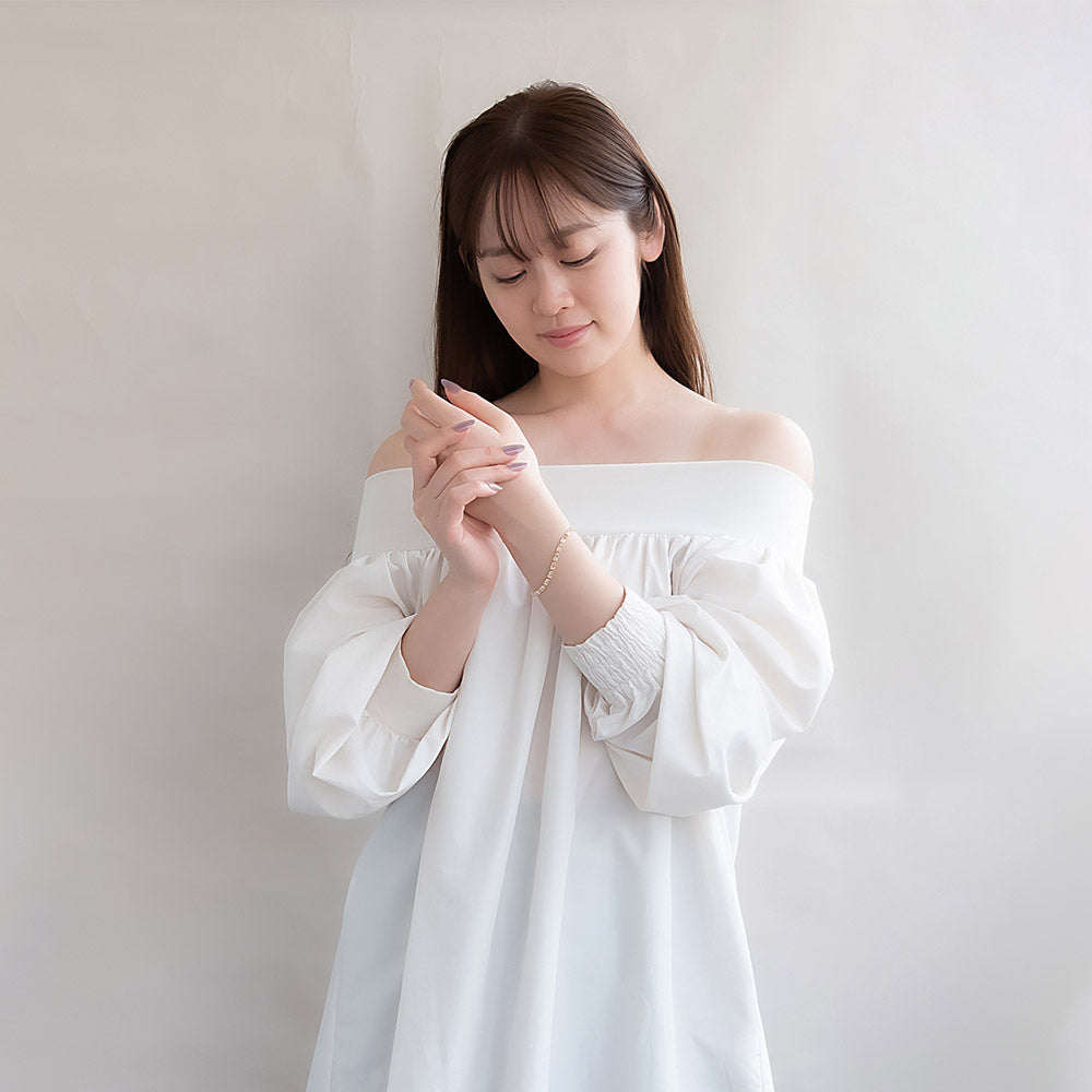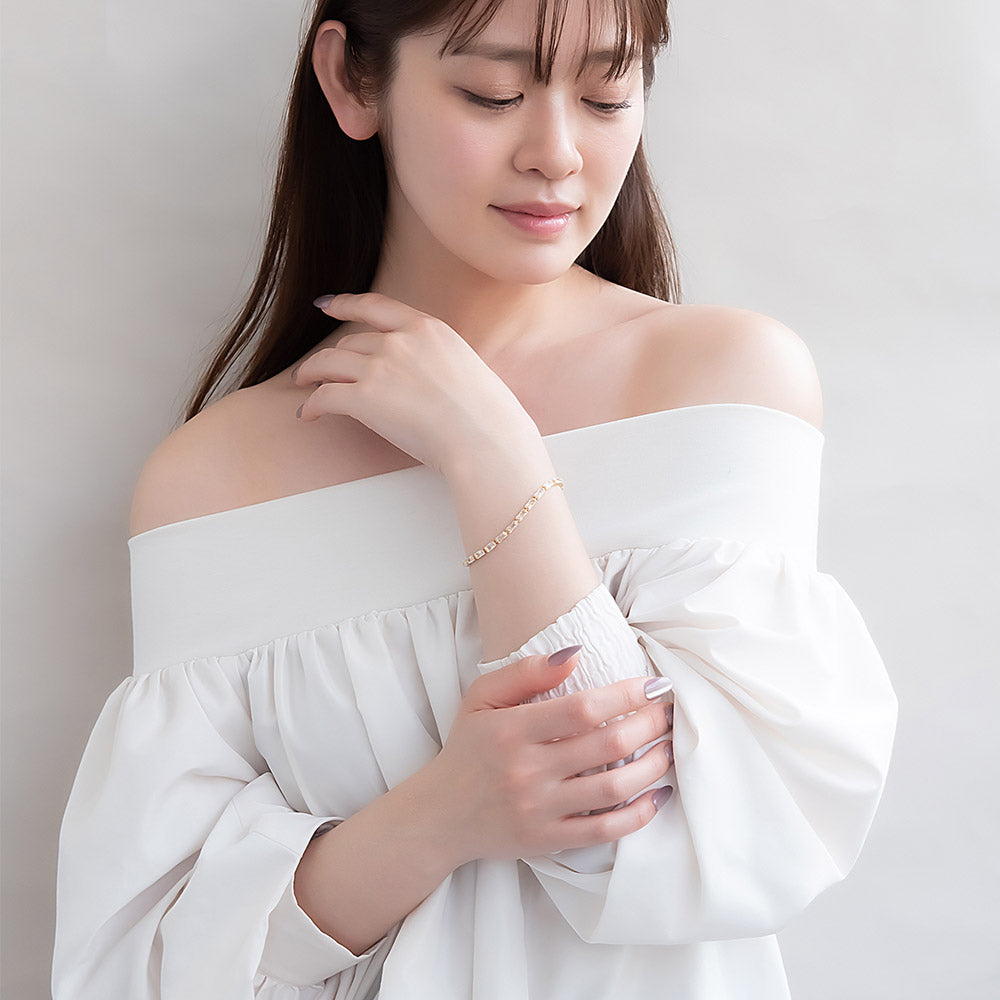 コーデのポイントになるキレイめブレスレットは、着けやすくサイズ調整が簡単なスライドアジャスターを使用。