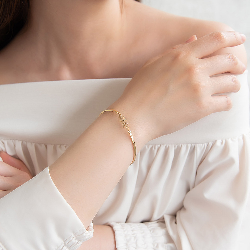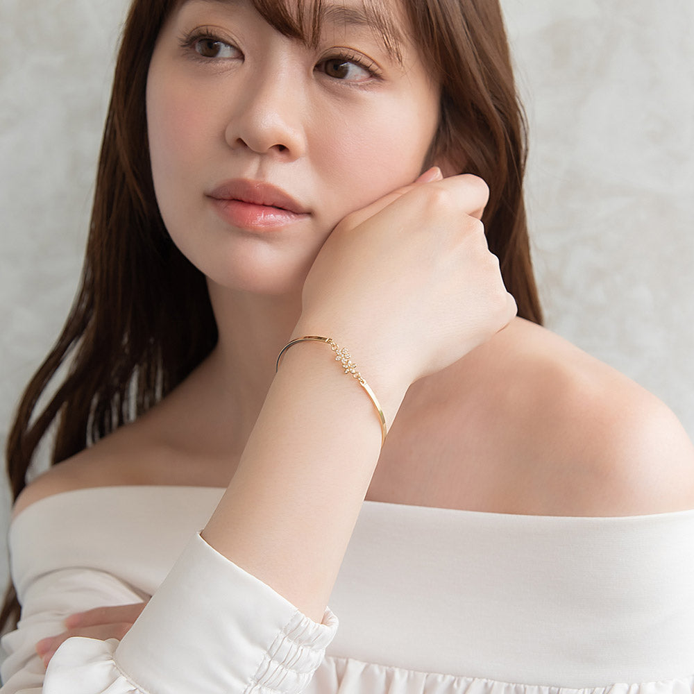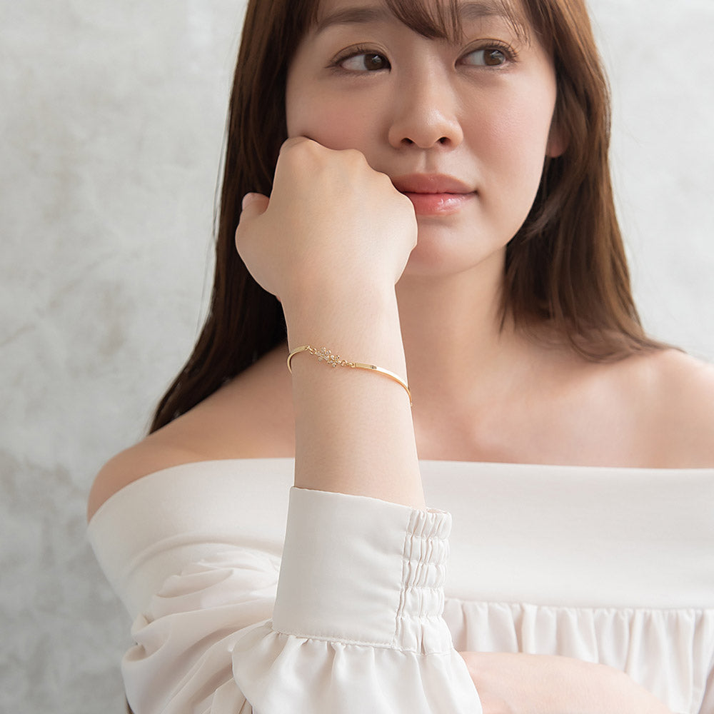 bl0603肌になじむ華奢なモチーフのブレスレットは、気取らずにつけておしゃれ度の上がるアイテム。ふと手元が目に入ったとき、テンションのあがるキレイめデザイン。キュービックジルコニアが上品に煌めき、華奢ながら存在感もあってコーデ映え。幅広いコーデと好相性。オールシーズン使えるメタルカラーで使い勝手◎