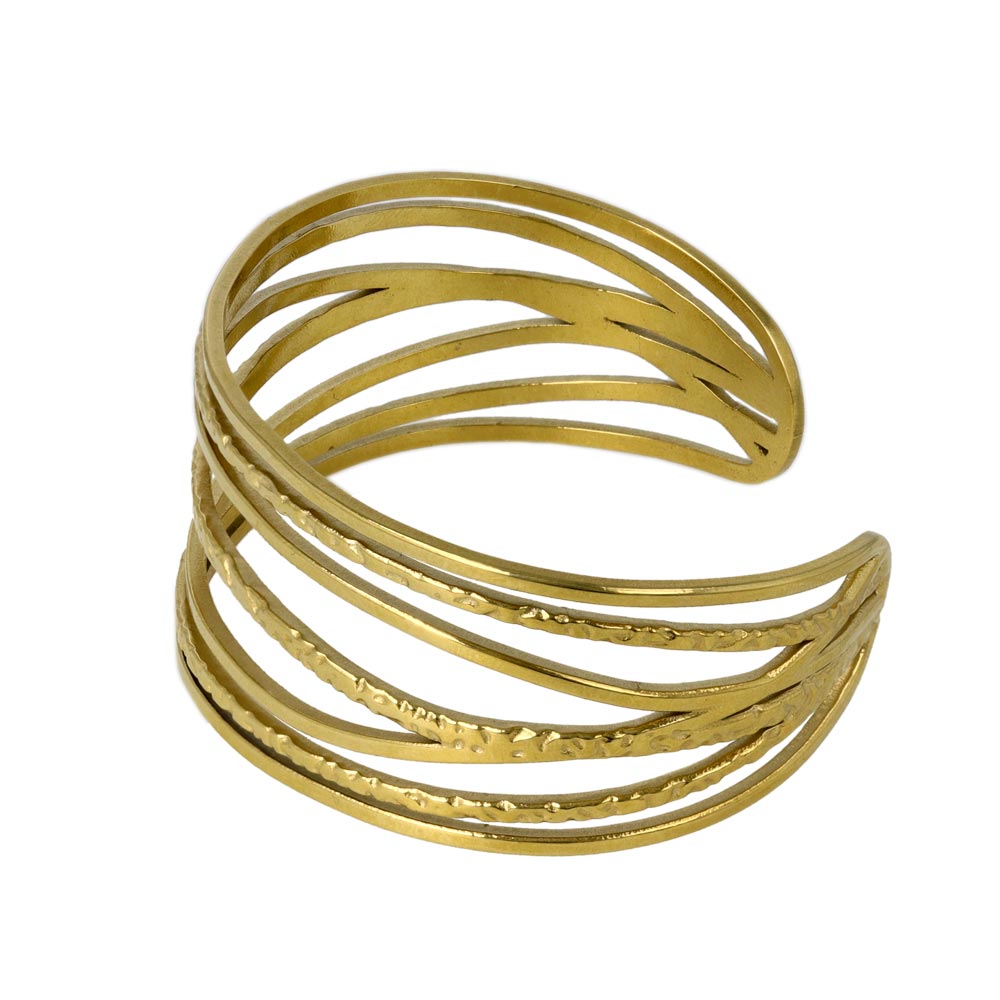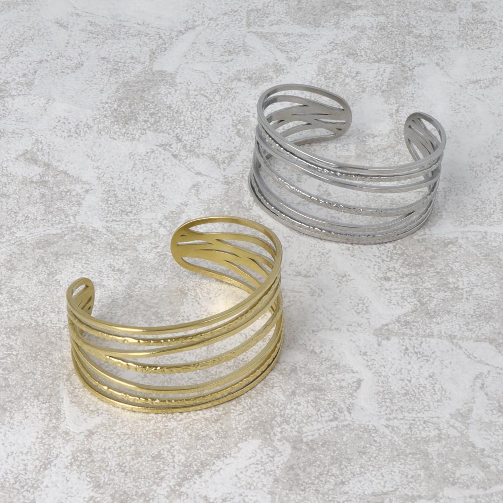 bl0642ラフにつけてお洒落に、コーデに取り入れやすいメタルのアイテム。存在感抜群のワイドバングル。目をひくインパクトあるデザインが魅力的。