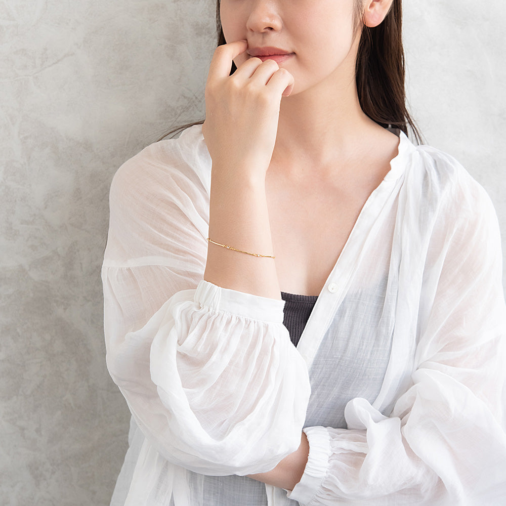 落下防止のセーフティーチェーン付きで安心。チェーンをひくだけで簡単装着、マグネット同士を近づけるだけ、磁石の留め具でラクにつけられるブレスレット。ひっかけるタイプの留め具が苦手な方や、ネイルアートをしている方にもおすすめです。機能性だけでなく、ファッションのポイントになるデザインも◎