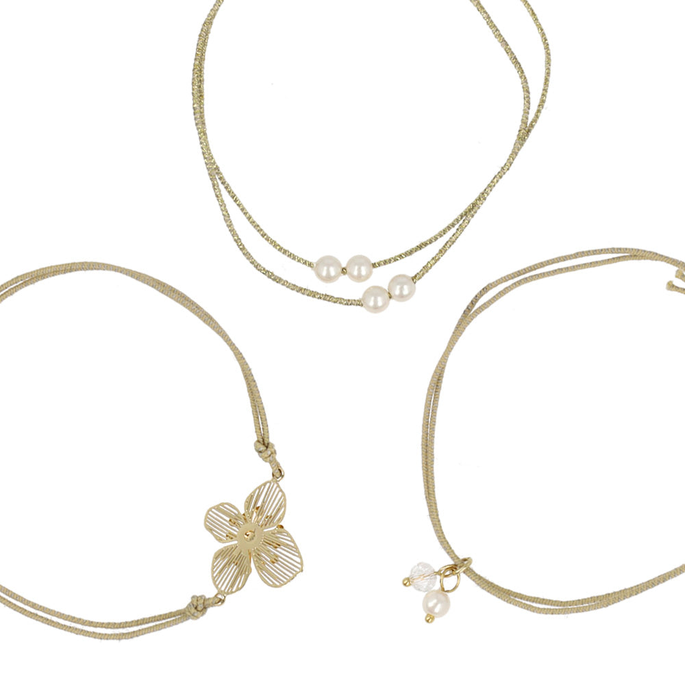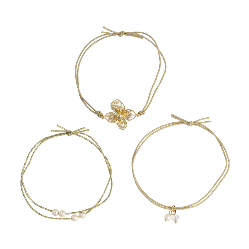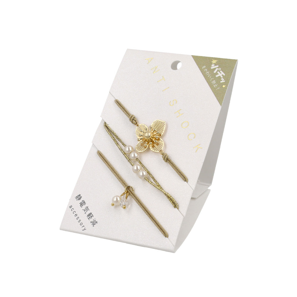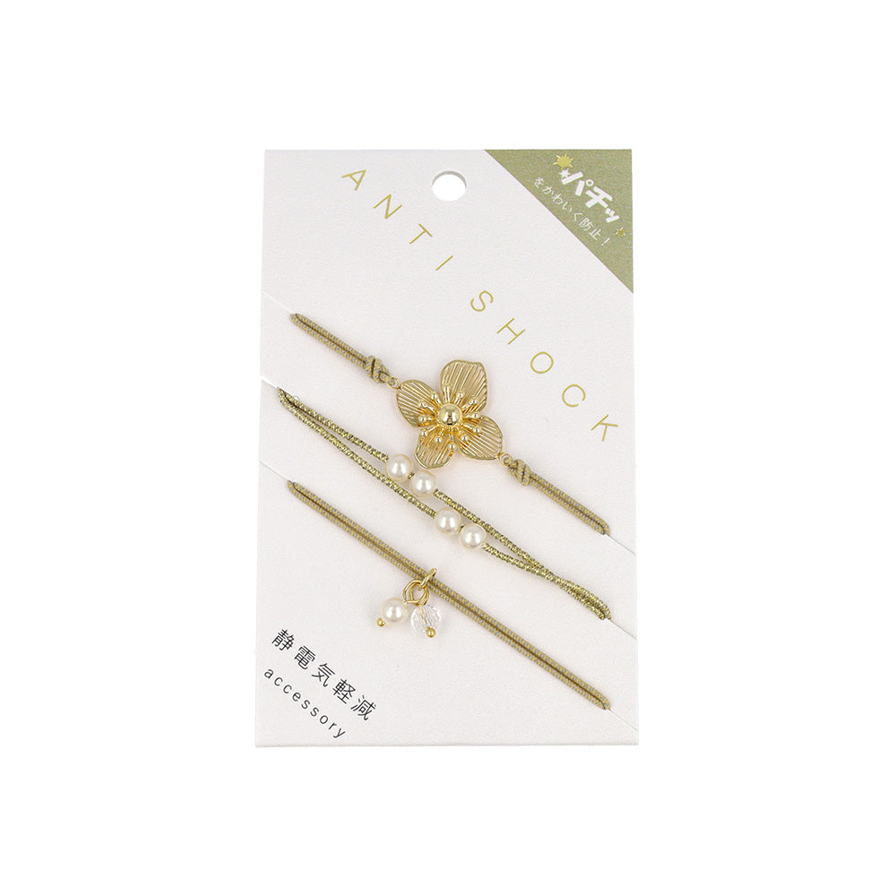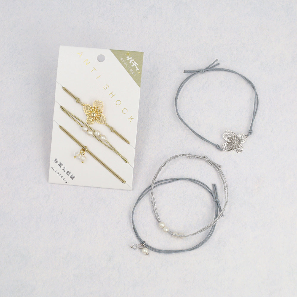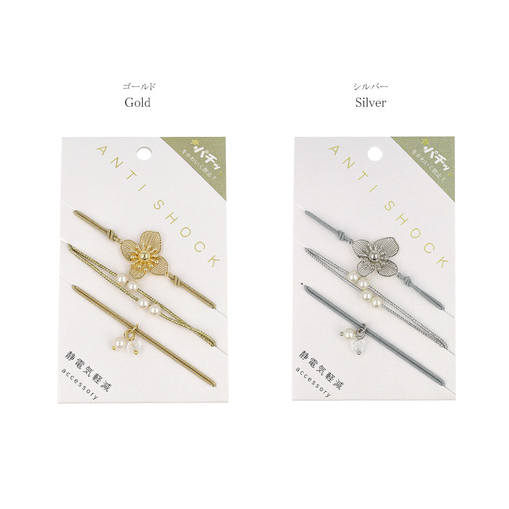 ブレスレット ANTI SHOCK 静電気軽減 ニッケルフリー メタル フラワー パール ビーズ ラメ糸 3本セット ゴムブレスレット
