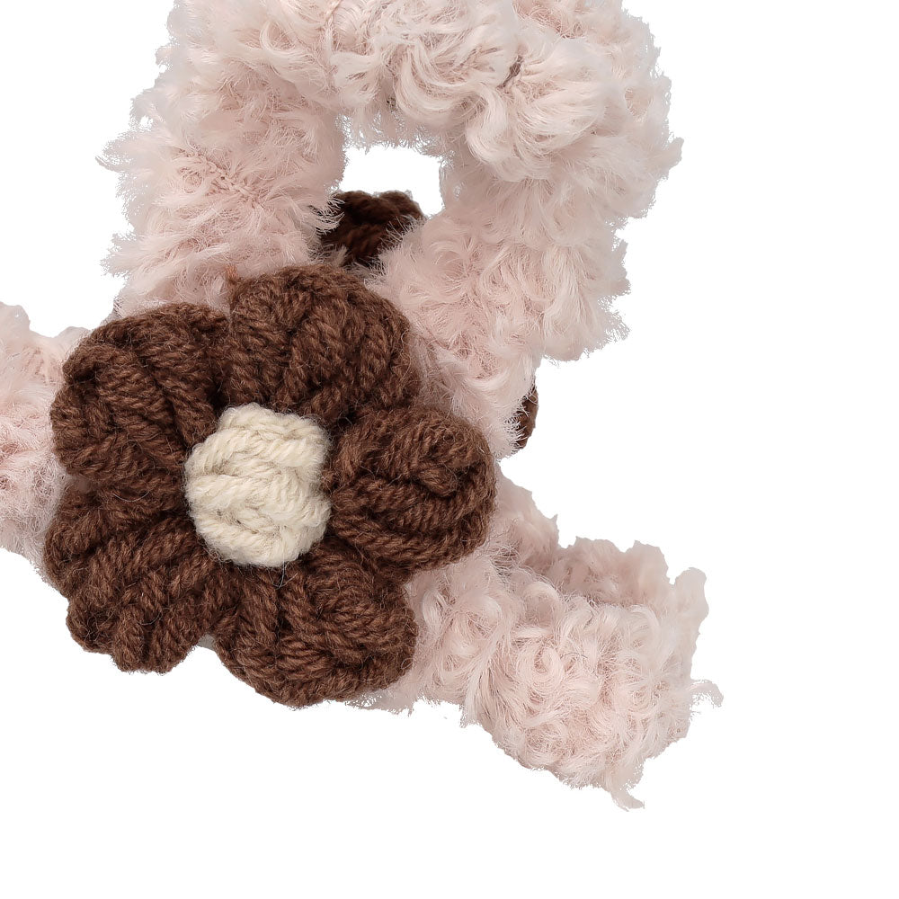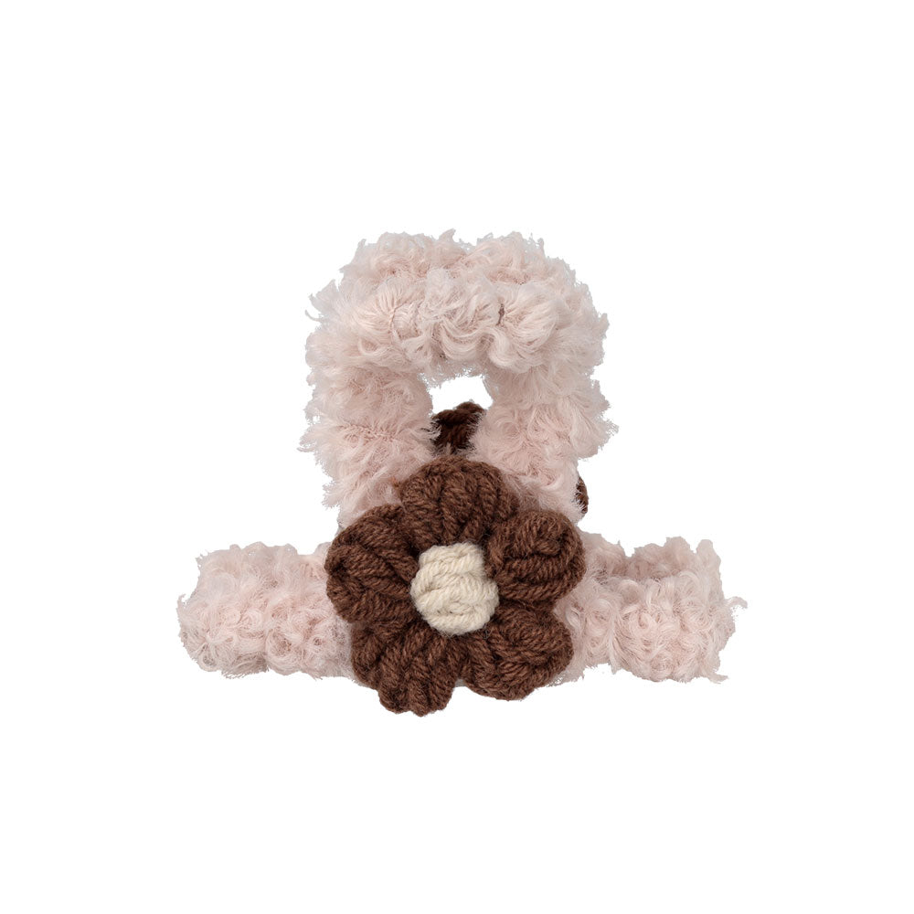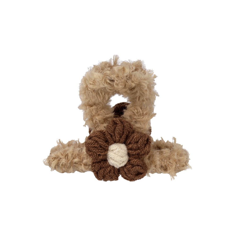 bs0785パッと目を引く旬素材、もこもこループバンスクリップ 。立体的なフラワーモチーフがポイントに。旬なブラウンカラーの配色が◎バックにつけても◎