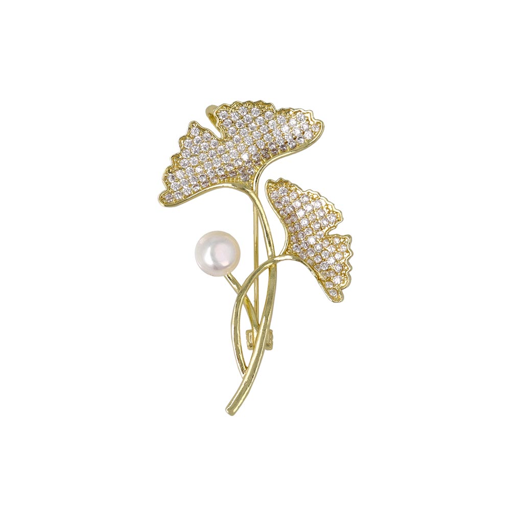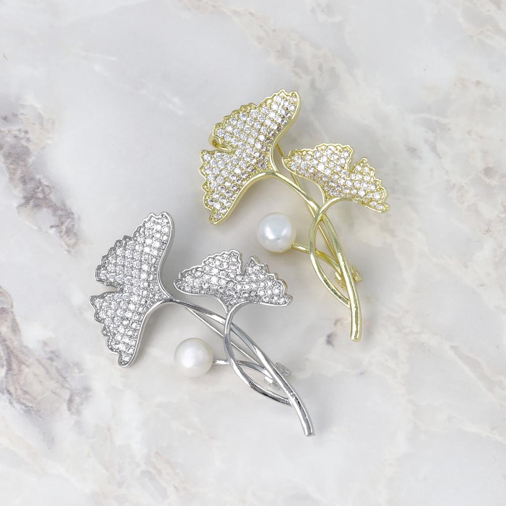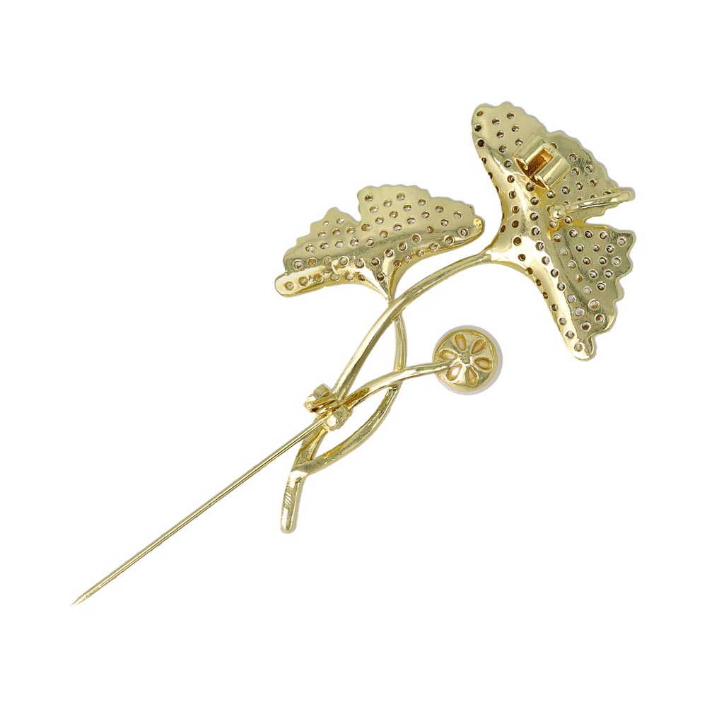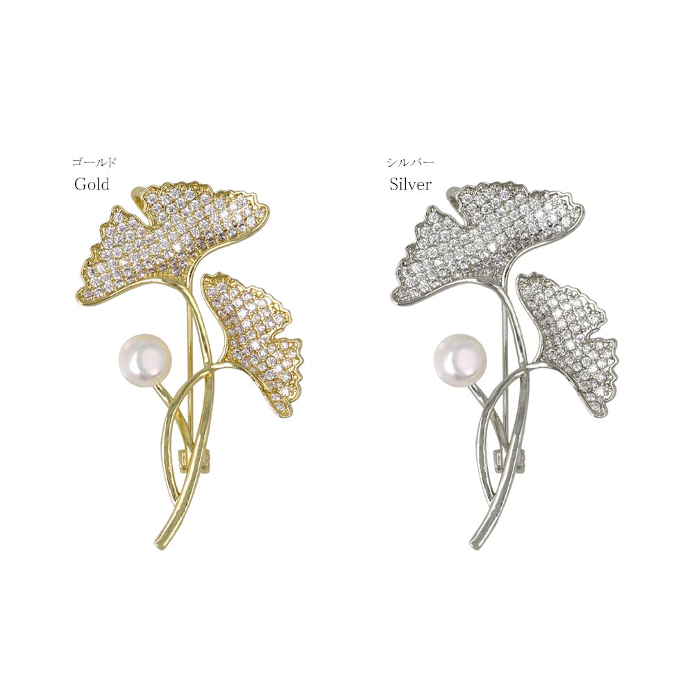 ブローチ メタル キュービックジルコニア 淡水パール イチョウの葉 ピンタイプ