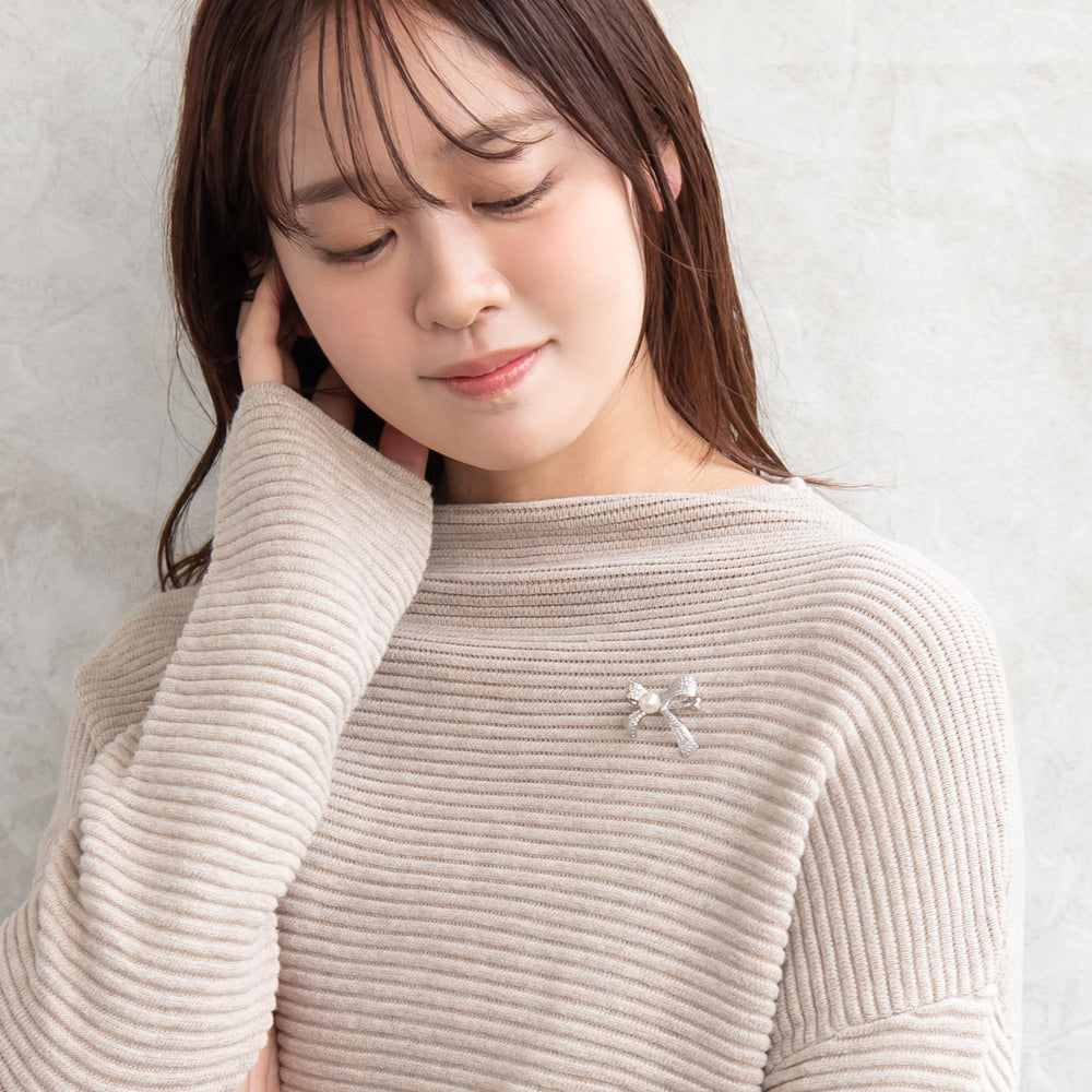 ブローチ メタル キュービックジルコニア 淡水パール アシンメトリー リボン ピンタイプ