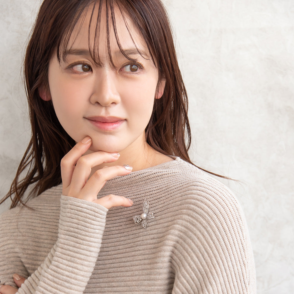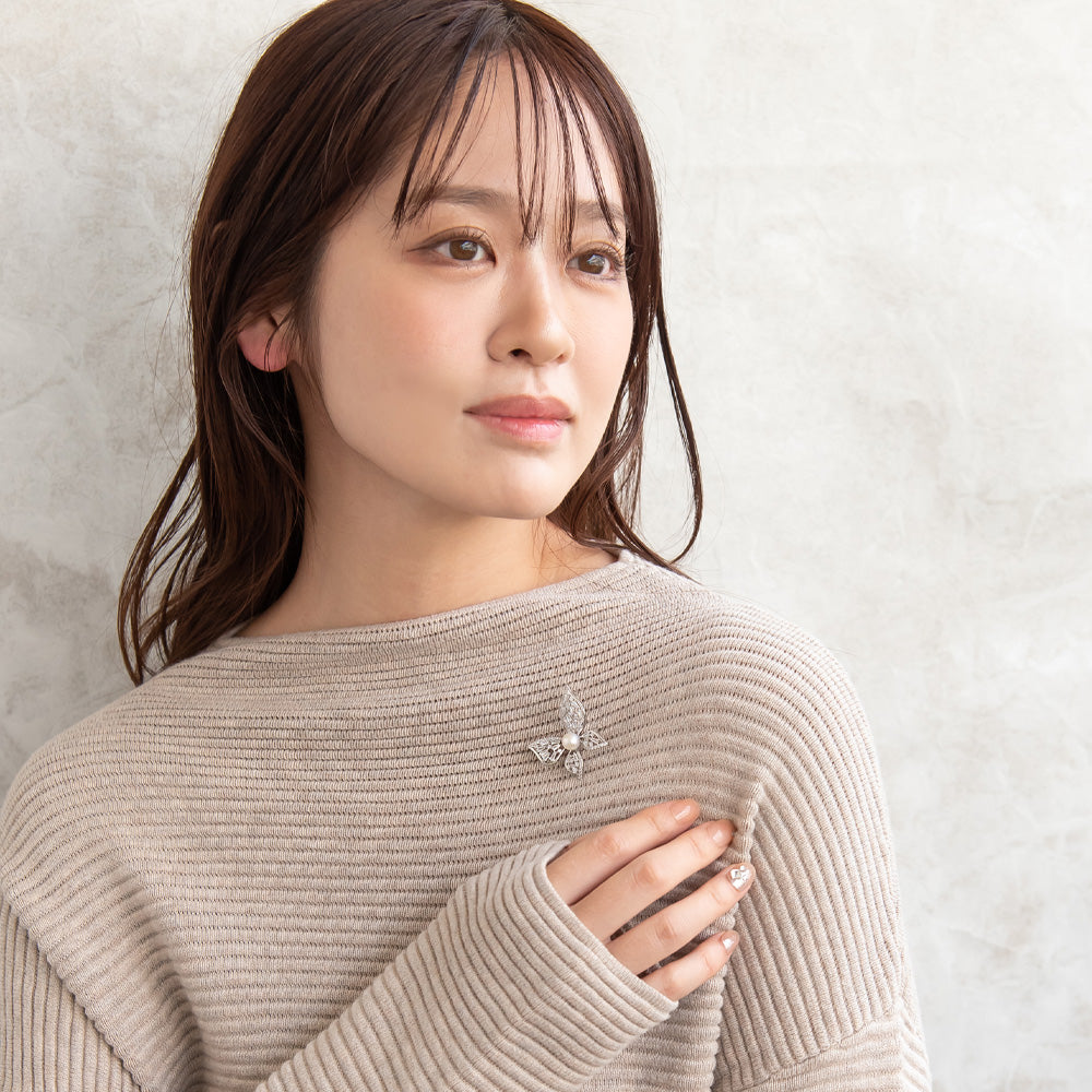 ブローチ メタル キュービックジルコニア 淡水パール バタフライ ピンタイプ