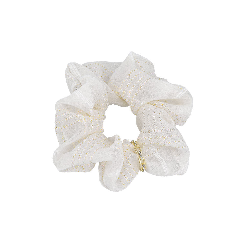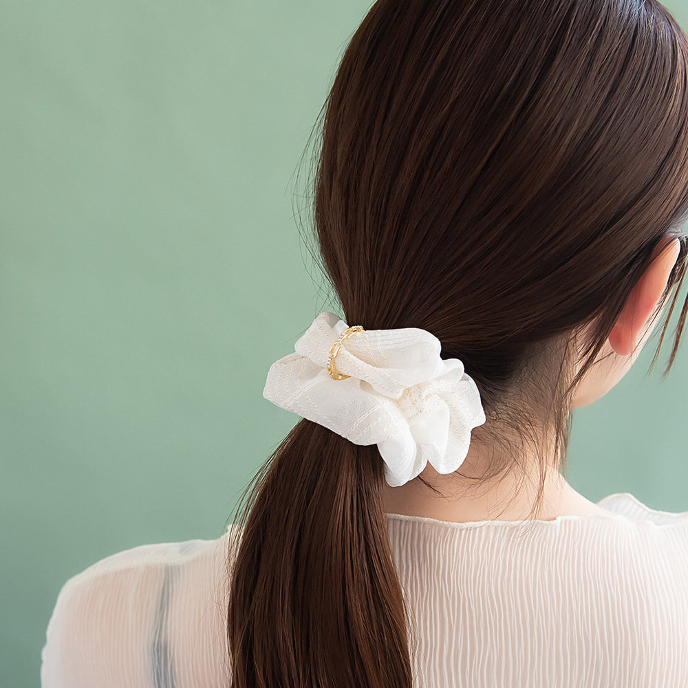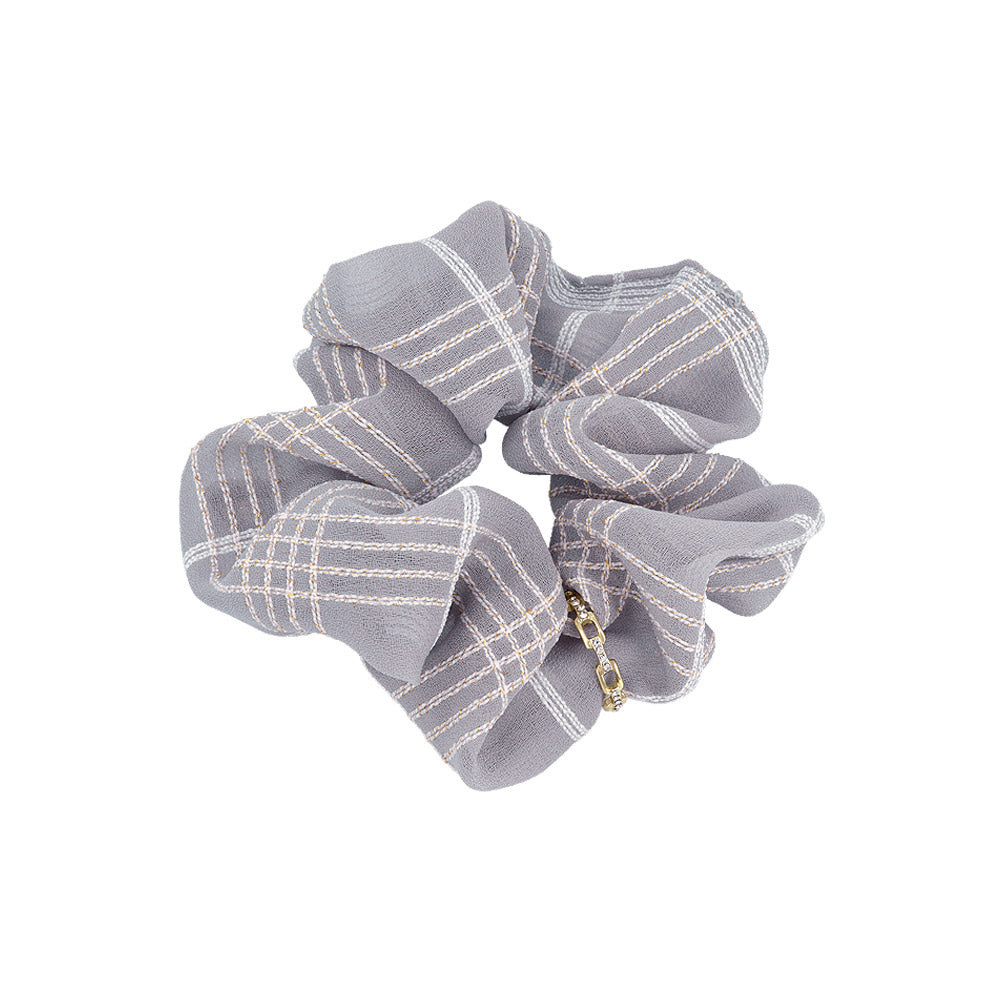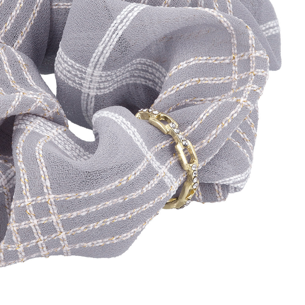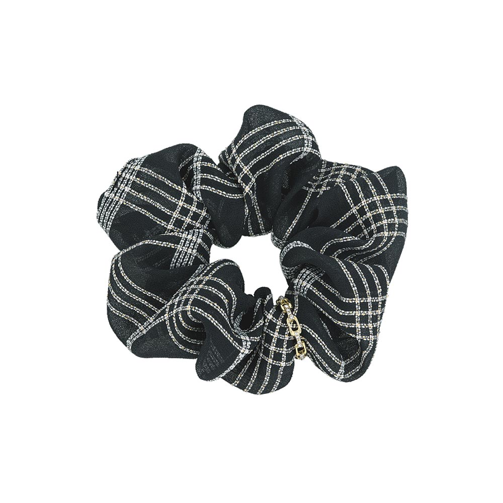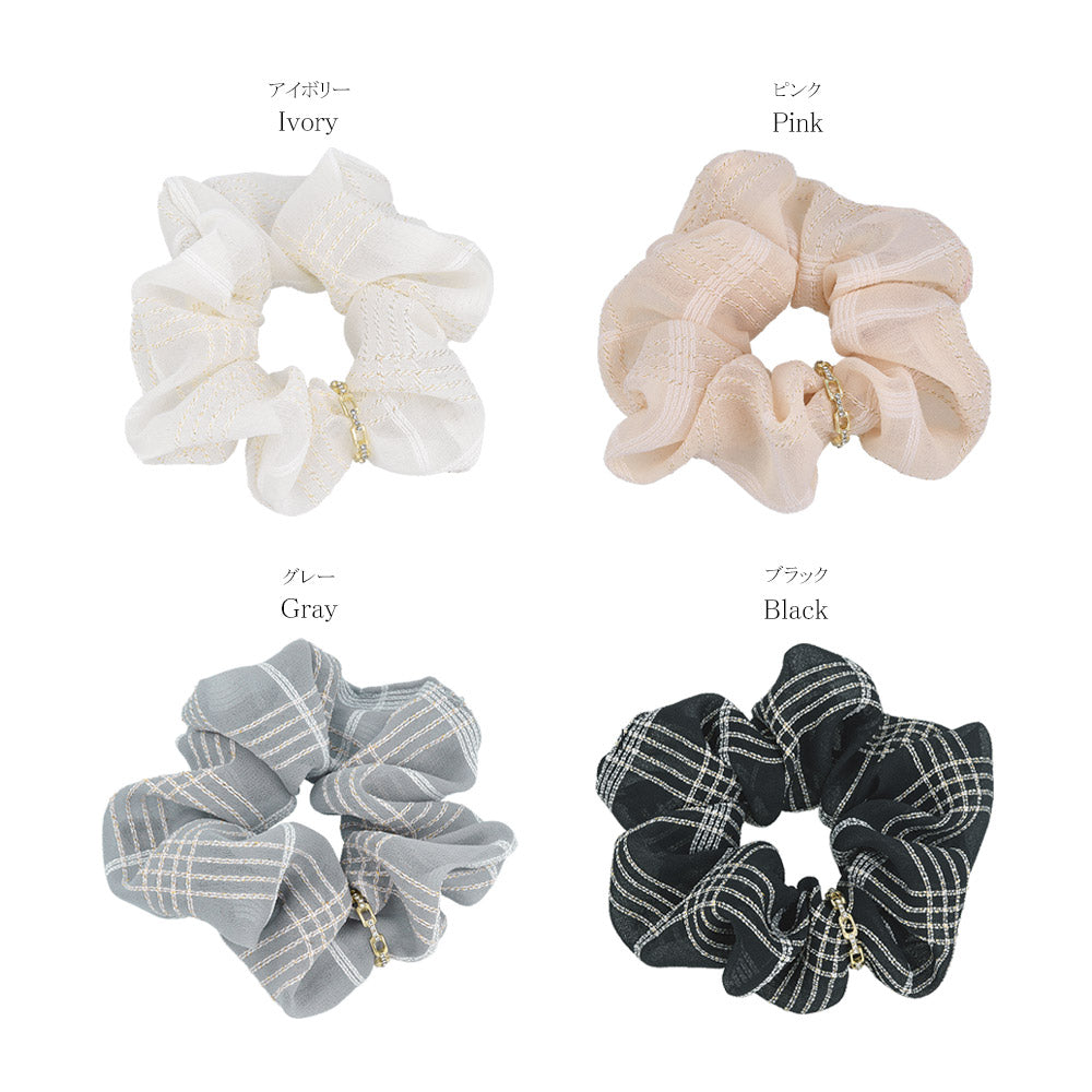 cc0241ほんのりシアーなチェック柄のシュシュ。ストーン付きの小さなチェーンリングがアクセントに。大人女子も取り入れやすい、さりげないチェック柄がかわいさのポイント。