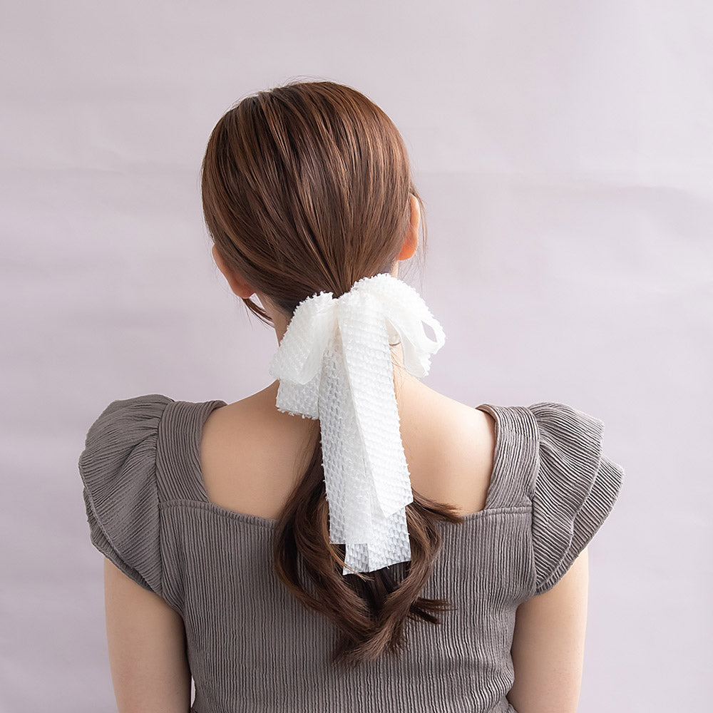 cc0270コーディネートに馴染みやすい、ナチュラルカラーのリボン付きシュシュ。ふわっとゆれるロングリボンがかわいい。後ろ姿もぬかりなく、心ときめくリボンアイテムでコーディネートに甘さをプラス。