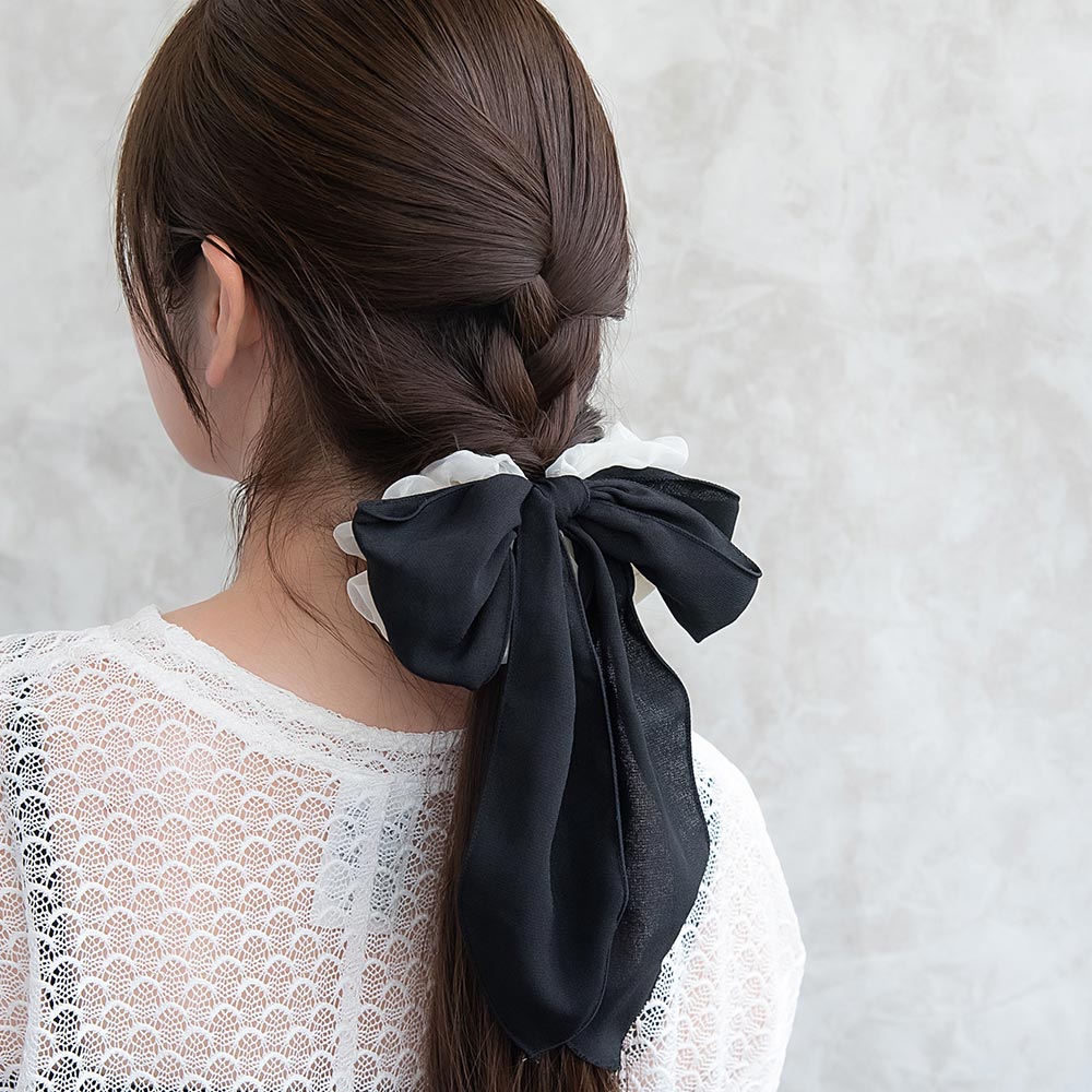cc0280ボリューム感たっぷりのフリルと大きめリボンがかわいいシュシュ。軽い着け心地で、結び跡がつきにくく髪にやさしいアイテム。