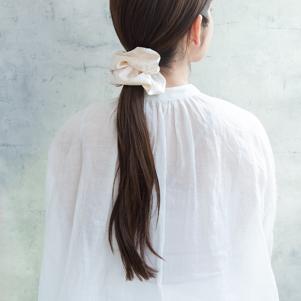 cc0286サテン生地にストーンを散りばめたボリューミーなシュシュ。軽い着け心地で、結び跡がつきにくく髪にやさしいアイテム。飽きの来ないベーシックカラーで様々なスタリングにマッチしてくれます。