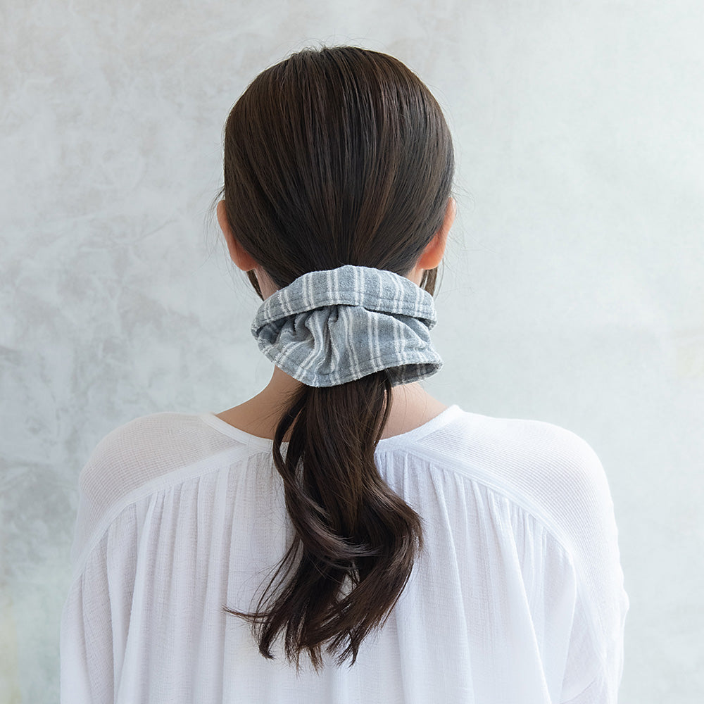 cc0296肌触りのよいパイル生地のシュシュ。コーデのアクセントになるストライプ柄が魅力的。お出かけにも、お家でも◎