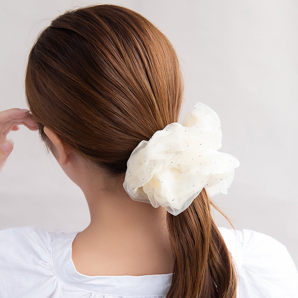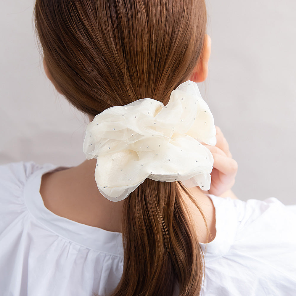 cc0329シアー感あふれるメタルドッドのシュシュ。ボリューミーな大きめサイズ。存在感抜群、プラスワンで可愛さもおしゃれ度もUP。