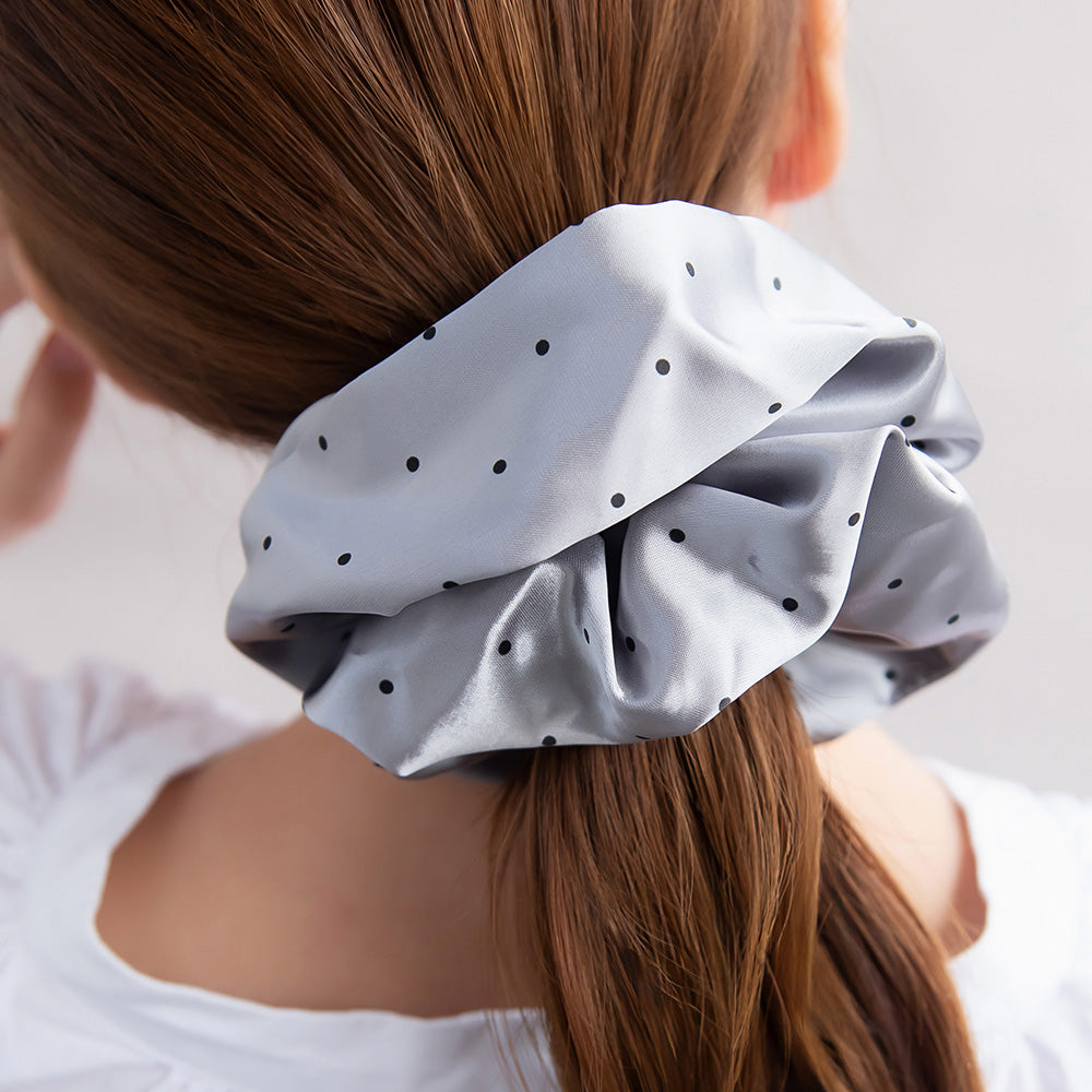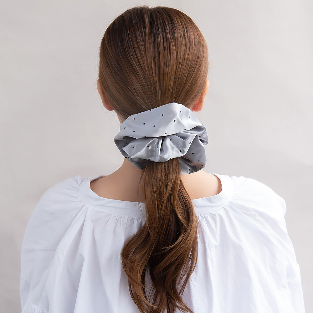 cc0342上品な光沢のドット柄サテンのシュシュ。軽い着け心地で、結び跡がつきにくく髪にやさしいアイテムです。