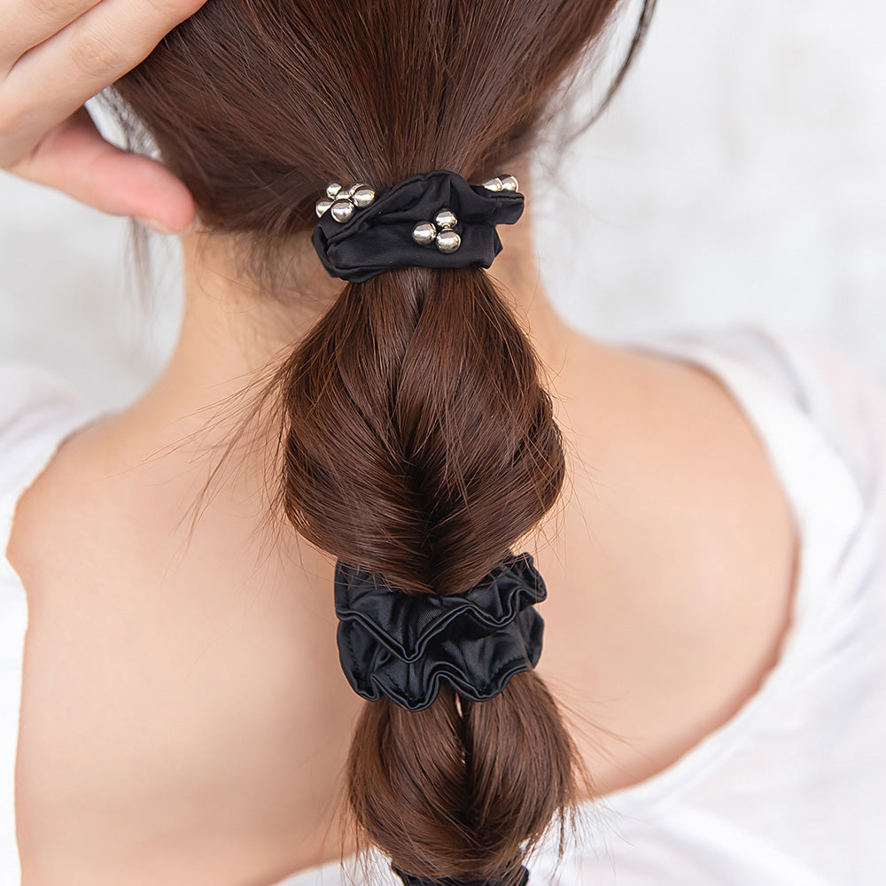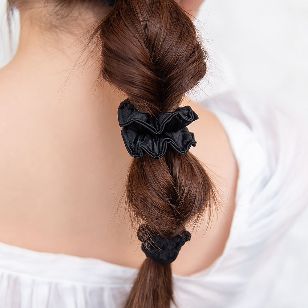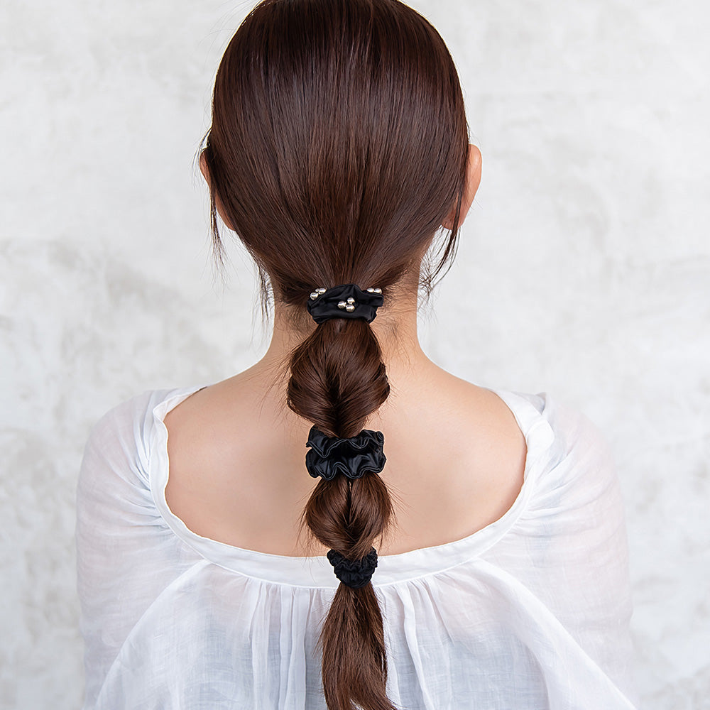 cc0347アレンジが楽しめるブラックカラーのシュシュの3個セット。結び跡がつきにくい髪にやさしいアイテムです。