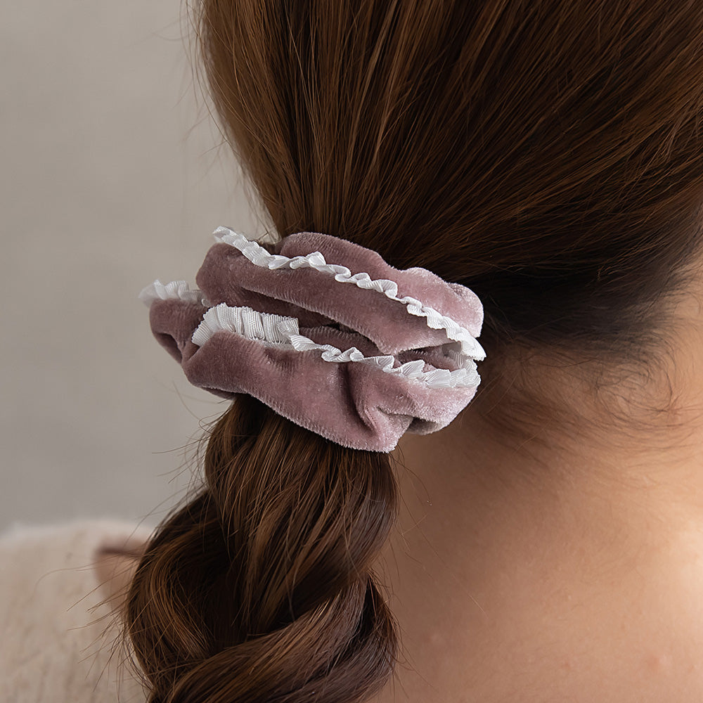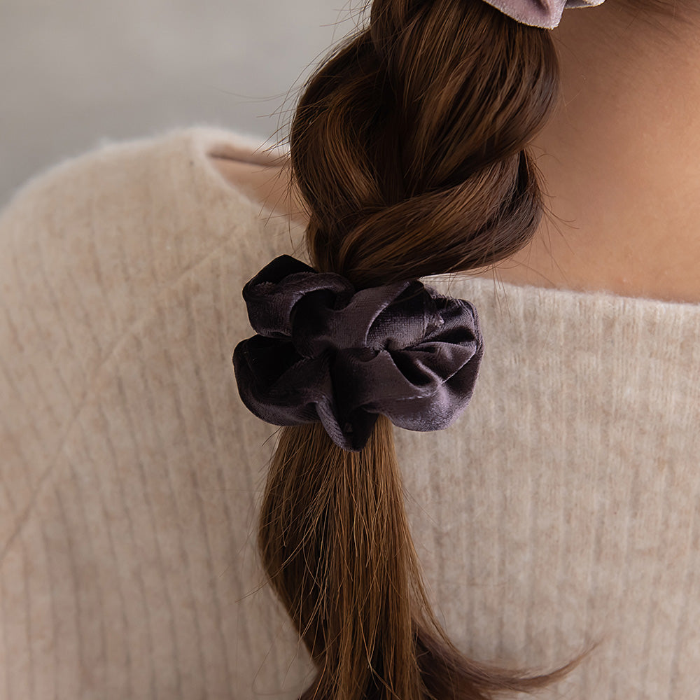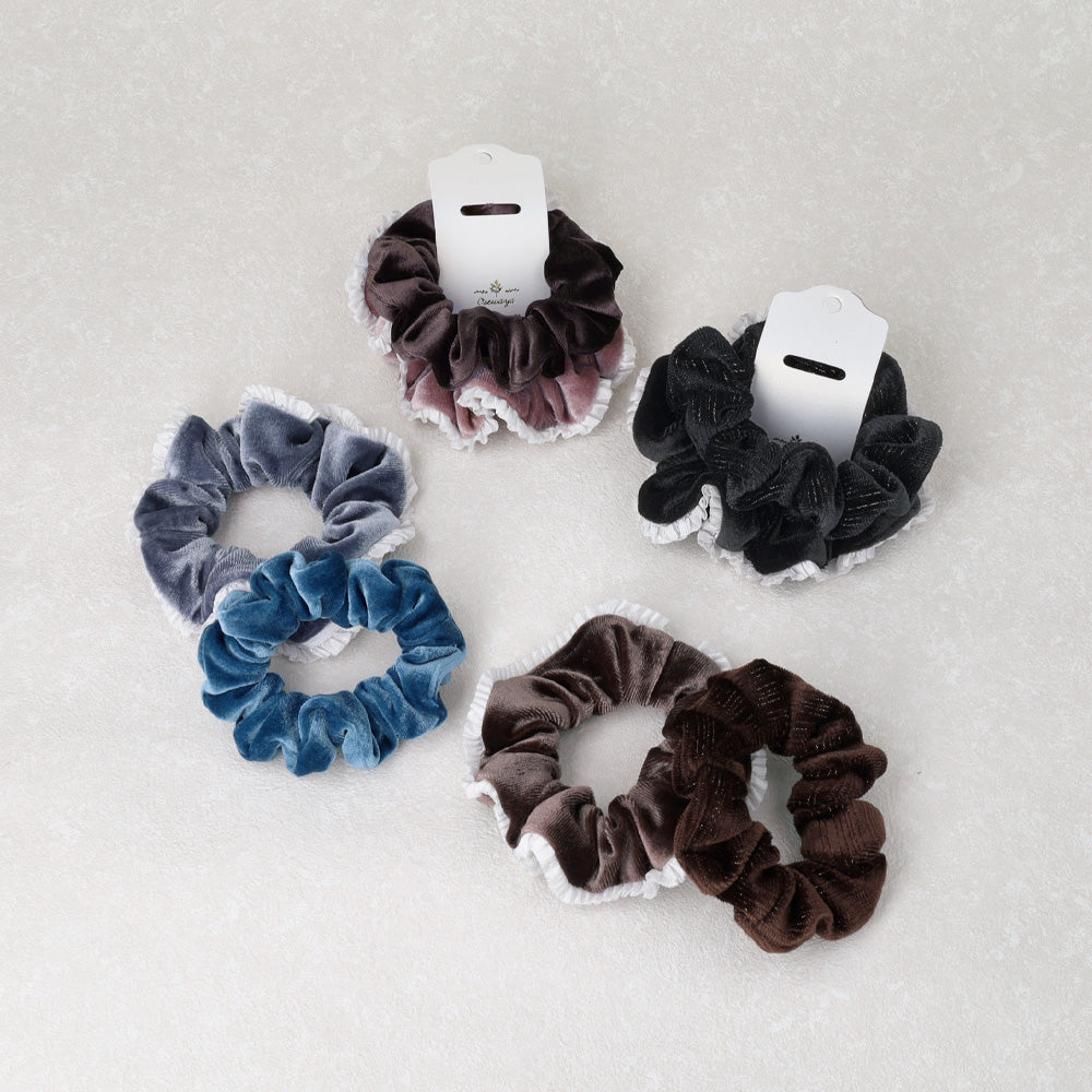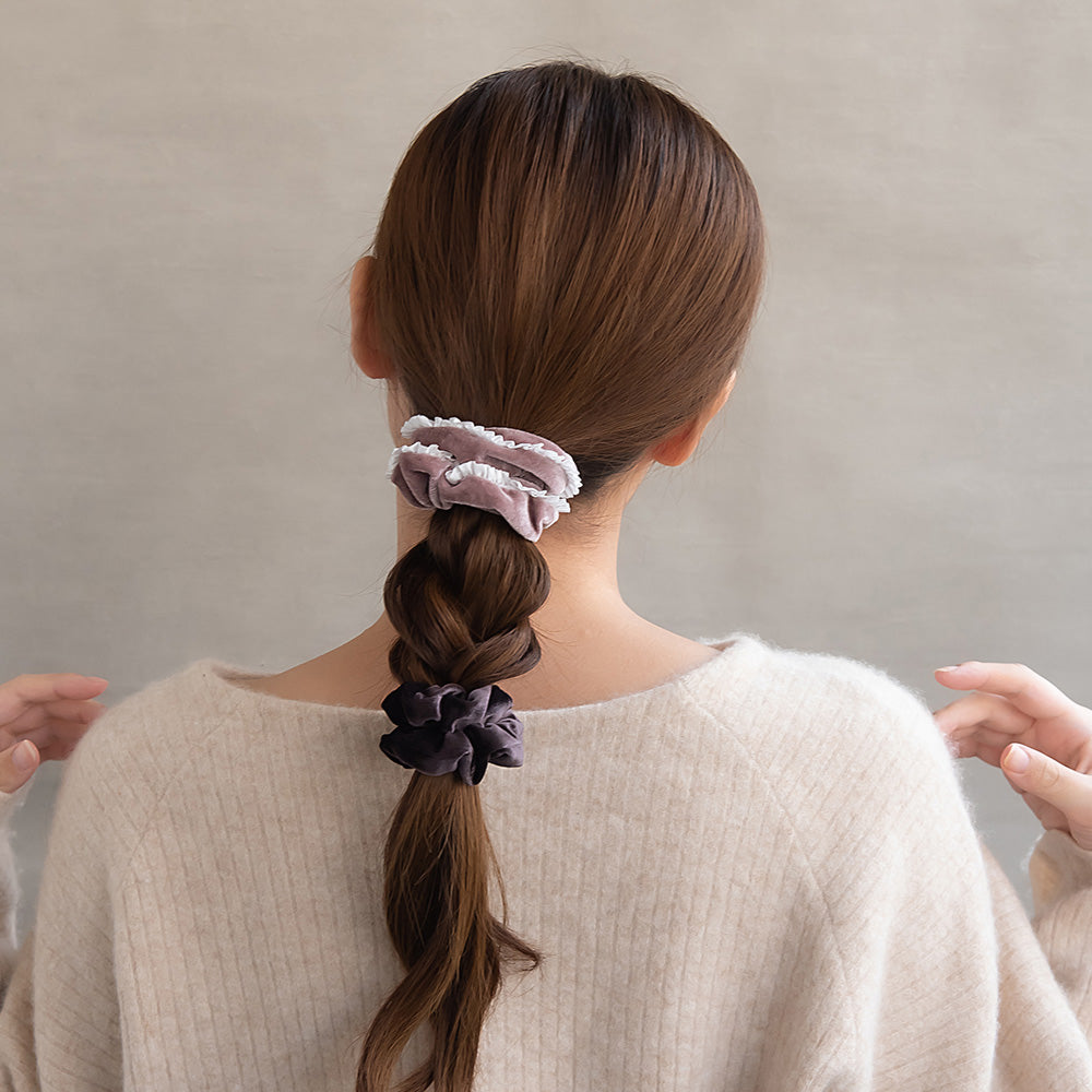 cc0354アレンジが楽しめるふんわりシュシュの2個セット。光沢感が美しいベロア調で、結び跡がつきにくい髪にやさしいアイテム。