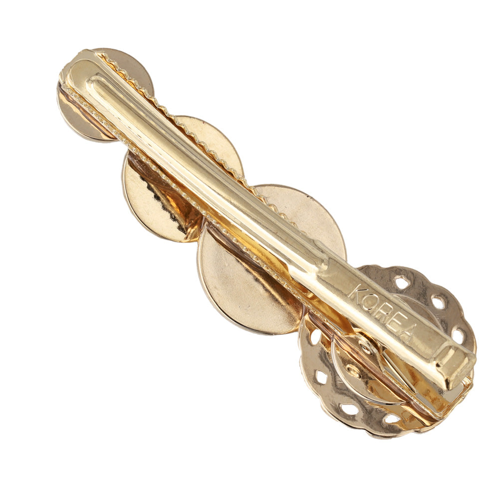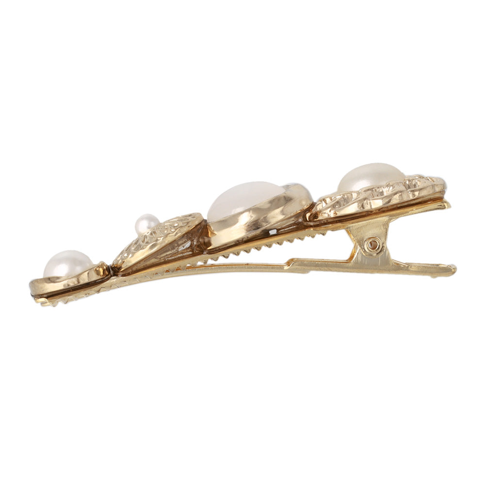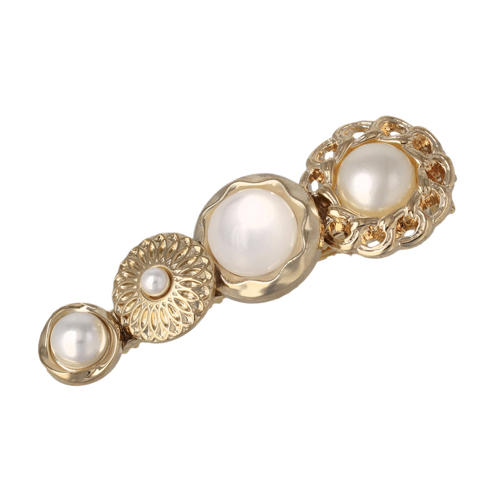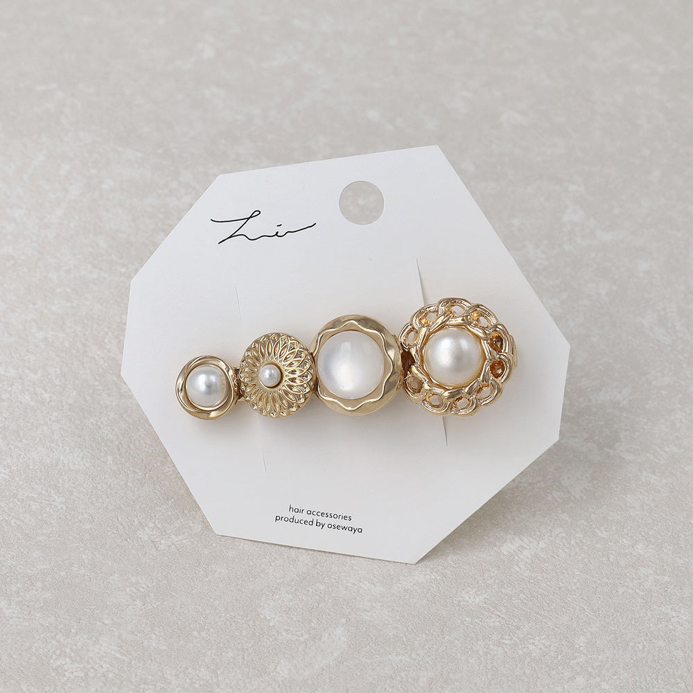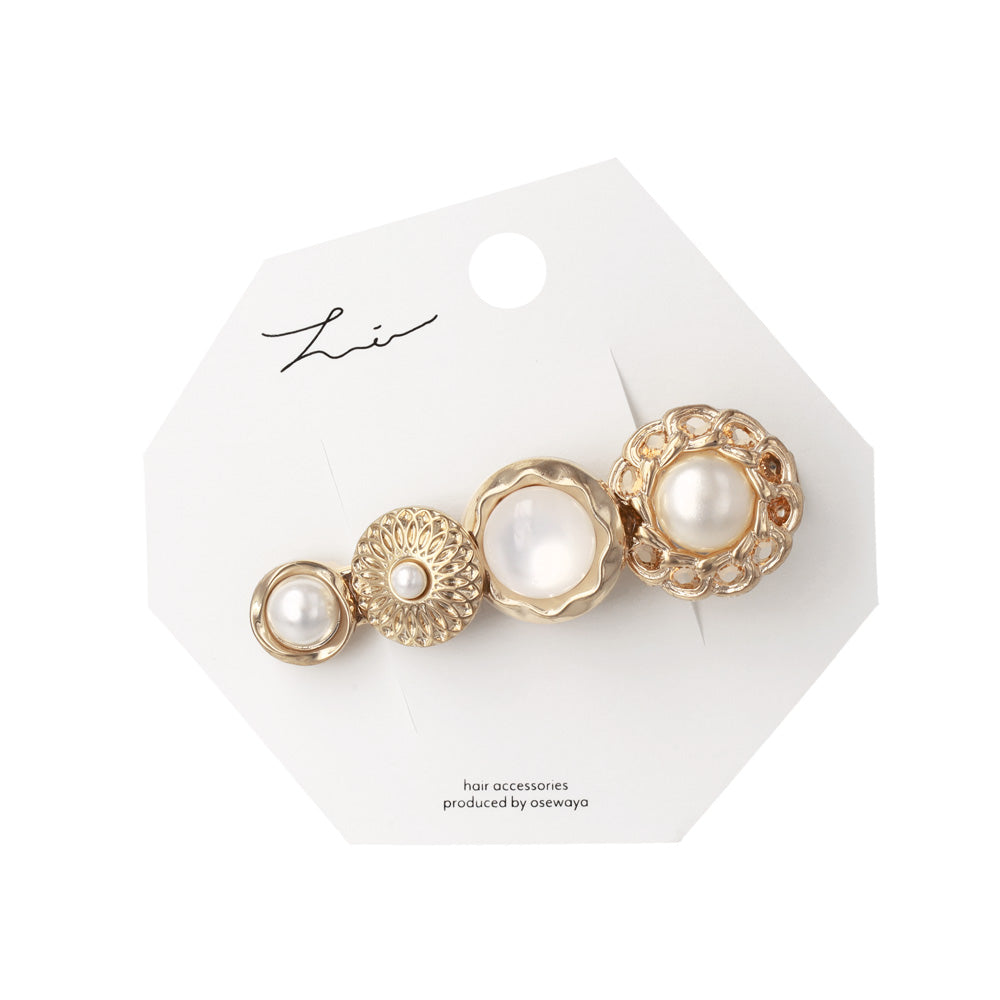 cl0396上品な華やかさを添えるパールデザインのヘアクリップ。異なるデザインのボタン風モチーフを贅沢に並べ、クラシカルな印象に。普段使いはもちろん、特別な日のお呼ばれヘアにもおすすめです。