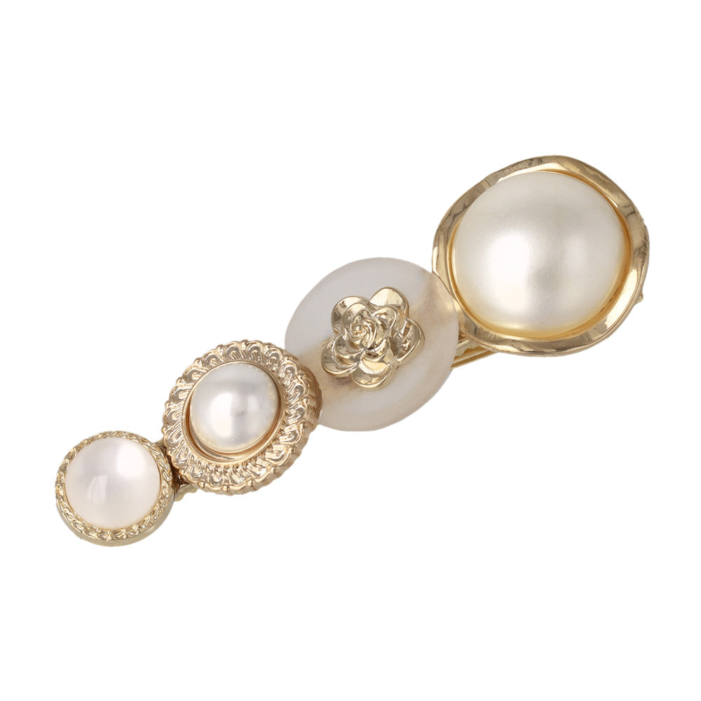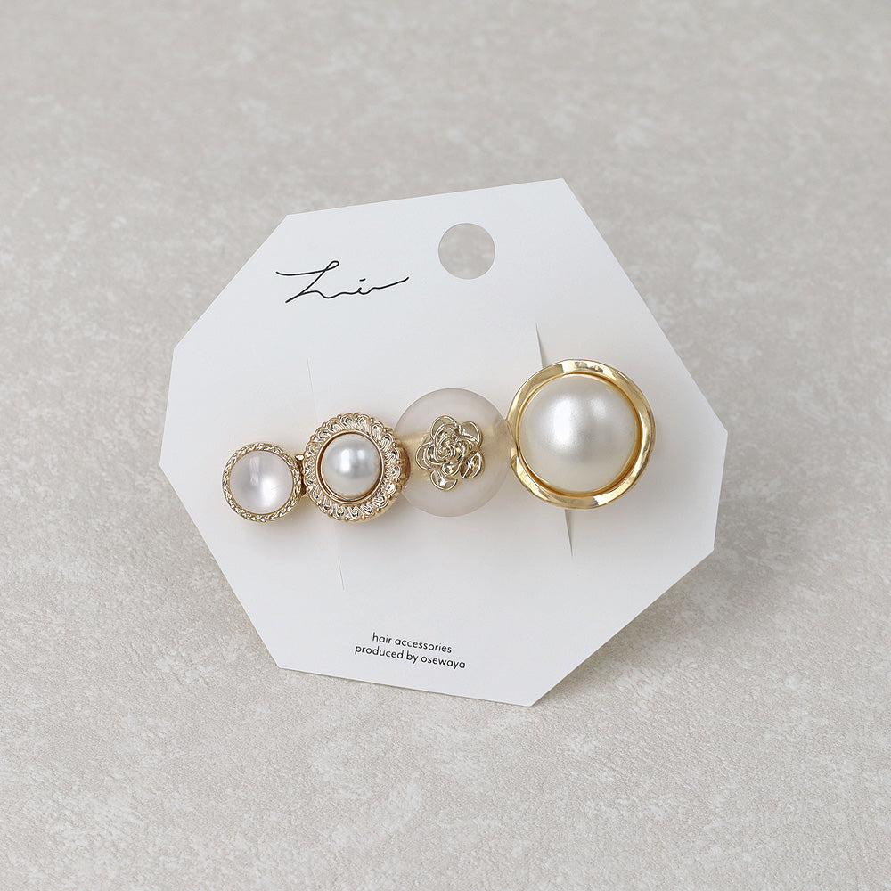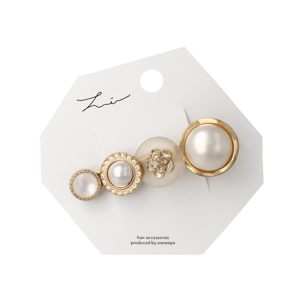 cl0397上品な華やかさを添えるパールデザインのヘアクリップ。異なるデザインのボタン風モチーフを贅沢に並べ、クラシカルな印象に。普段使いはもちろん、特別な日のお呼ばれヘアにもおすすめです。