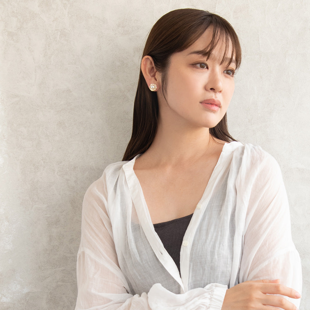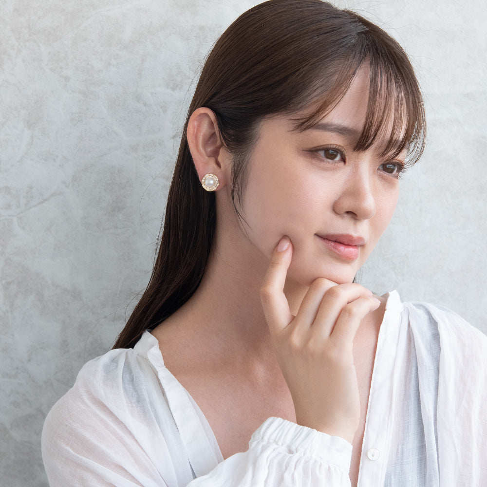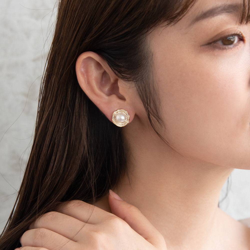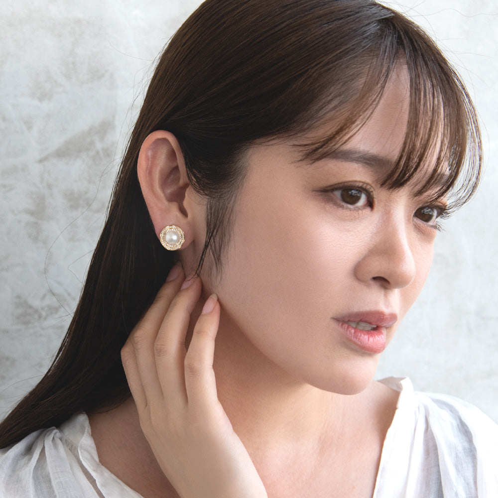 er1064やわらかくなめらかな輝きを放つ、淡水パールのアクセサリー。美しさが引き立つ、キュービックジルコニアを贅沢にあしらったメタルフレームのイヤリング。華やかに品よく、いつものスタイリングを格上げしてくれるパールのアイテム。